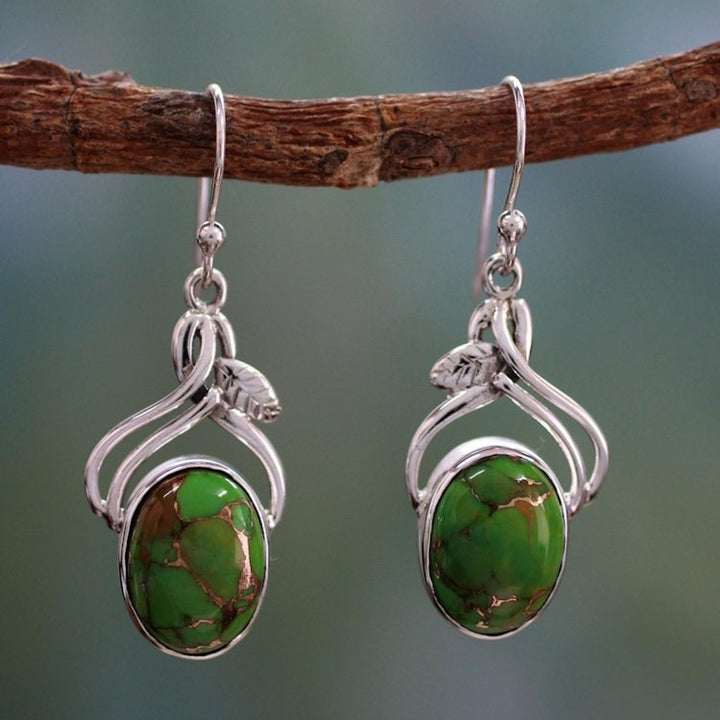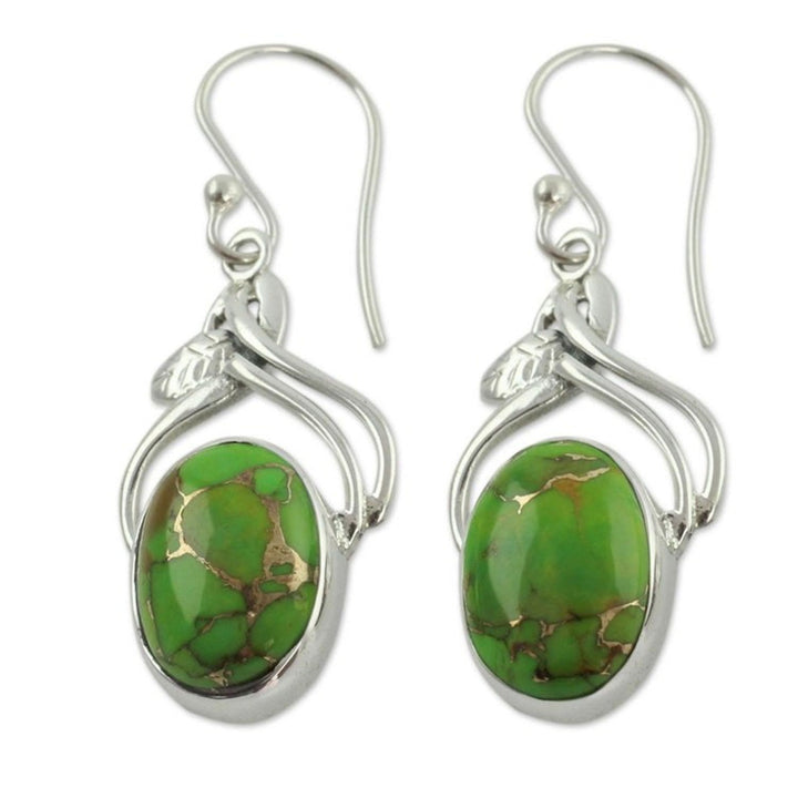 These Handcrafted Sterling Silver Earrings from India 'Green Dew' by Independent Artisans are a beautiful and mystical accessory. Designed by Shanker, the earrings feature green and gold composite turquoise gems that glisten like mystical drops of dew caught between sterling silver branches. The piece, which is a beautiful blend of perseverance, tradition, and passion, is a beautiful representation of the artisan's commitment to quality and originality.