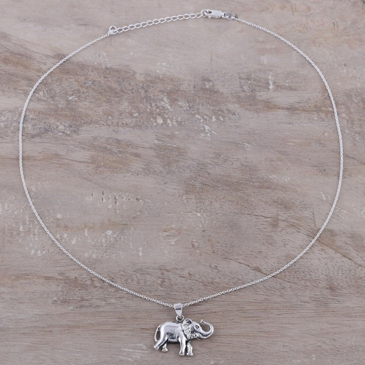 This Handcrafted Sterling Silver Elephant Pendant Necklace 'Gleeful Elephant' by Independent Artisans is a happy and charming accessory. Designed by Neetu Barathi, the necklace features a handcrafted sterling silver elephant pendant with its trunk held high. The elephant pendant hangs from a sterling silver cable chain that has an extender for adjusting the length. The piece, which is a blend of tradition and modernity, reflects the artisan's creativity and discipline.