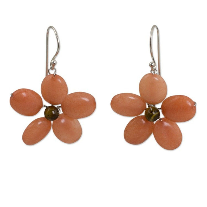 These Handcrafted Thai Quartz Tiger Eye Flower Earrings 'Ginger Chang Mai Flower' are a beautiful and natural accessory. Designed by Nareerat, the earrings feature daisies with petals of polished orange quartz and warm tiger's eye centers. The flowers dance on sterling silver hooks. The pieces are a celebration of nature, color, and community empowerment.