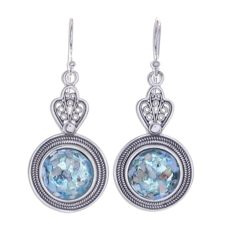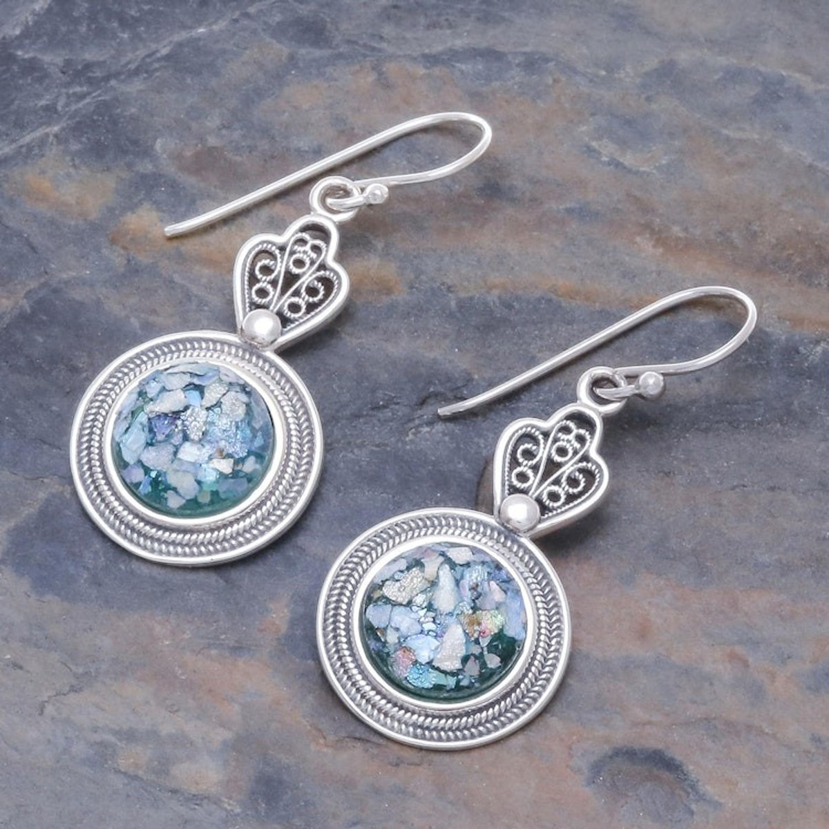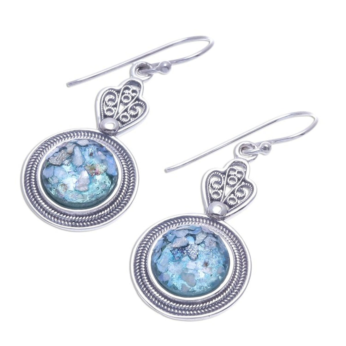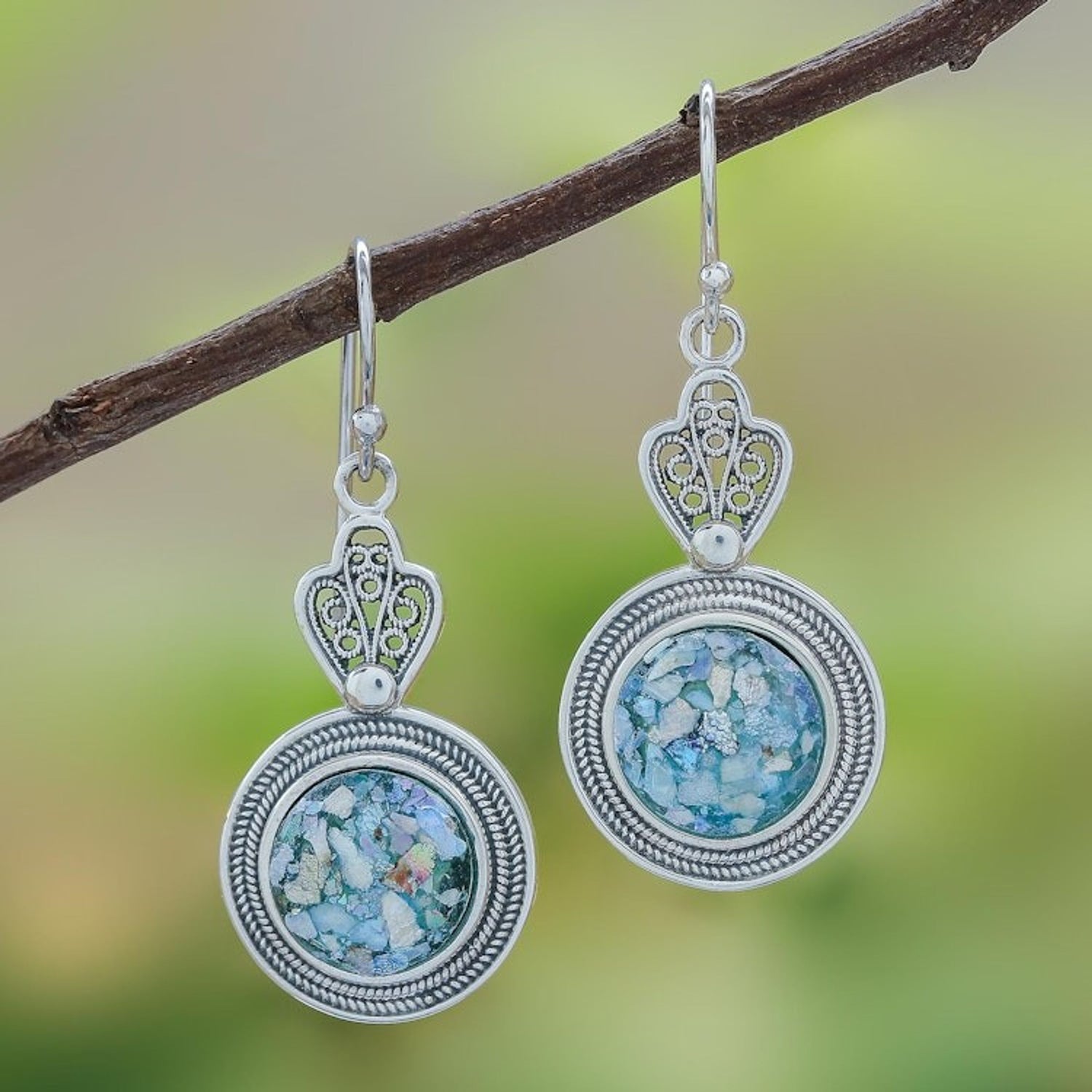 These Handcrafted Thai Sterling Silver and Roman Glass Earrings 'Mesmerizing Color' are a mesmerizing and ancient accessory. Designed by Michael Krainer, the earrings feature shimmering Roman glass that began life as a vase, jug, or vessel. Uncovered from ancient Roman archaeological sites in Israel, the glass has been transformed by the very earth in which it rested. The pieces, which are a blend of tradition with innovation, are a beautiful way to connect with the past.