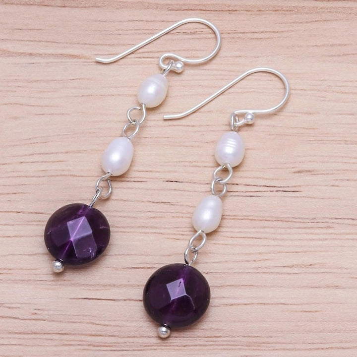 These Handmade Amethyst and Cultured Pearl Dangle Earrings 'Purple Night' are a charming and unique accessory. Designed by Srimuang, a translucent amethyst orb hangs from two cultured pearl ovals. The pieces, which are inspired by nature and Thai traditions, are a beautiful representation of the artisan's personal and expressive style.
