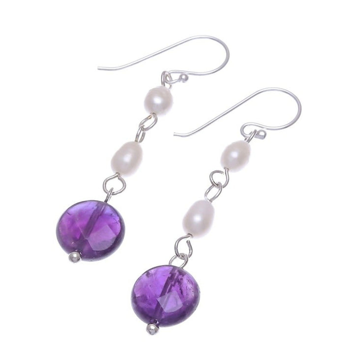 Handcrafted in Thailand with .925 sterling silver, cultured freshwater pearls, and amethyst. Each earring measures 2 inches in length and 0.4 inches in width. Natural variations in stone color and variegation are expected.