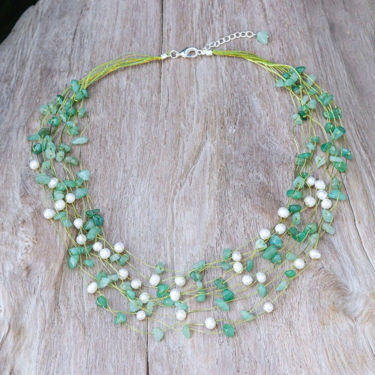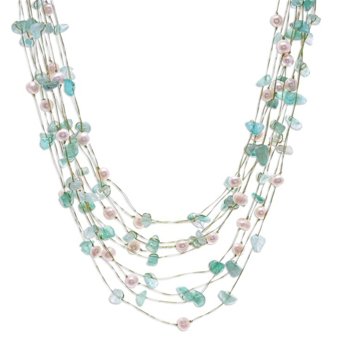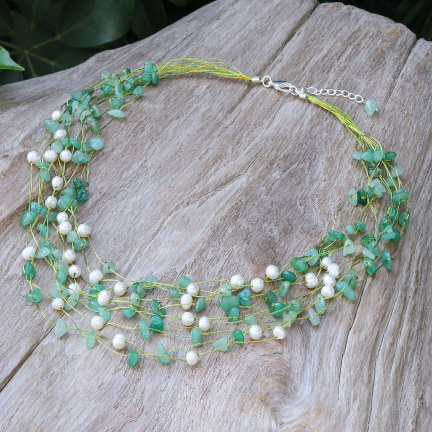 Handcrafted in Thailand with aventurine, freshwater cultured pearls, metallic thread, and .925 sterling silver-plated brass findings. The necklace measures 20.8 inches in length and 1.2 inches in width. Colors may vary slightly.