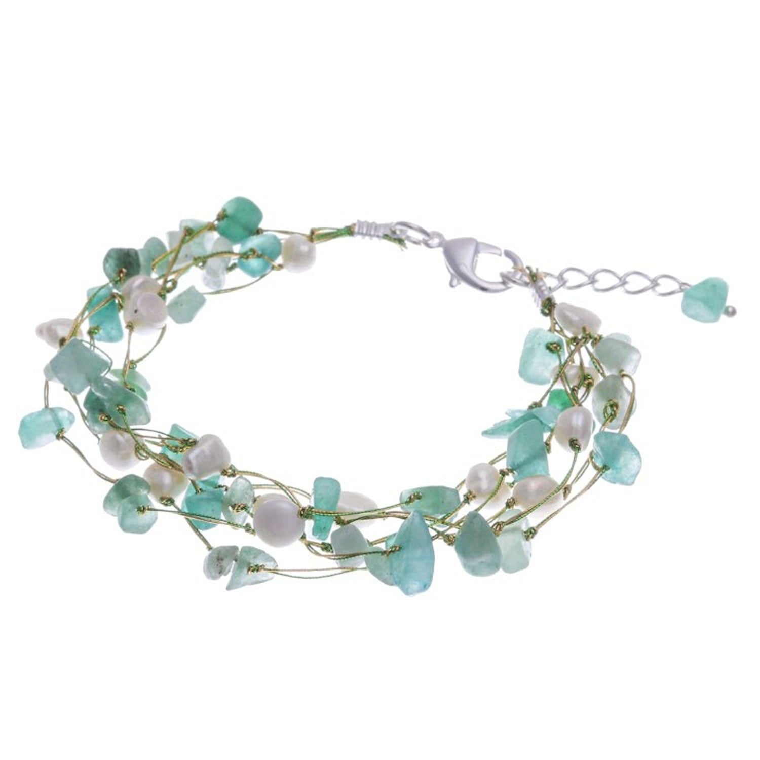 Handcrafted in Thailand with aventurine, cultured pearls, metallic thread, and .925 sterling silver-plated brass fixtures. It measures 7.5 inches in length with a 1-inch extender. Colors and motifs may vary slightly.