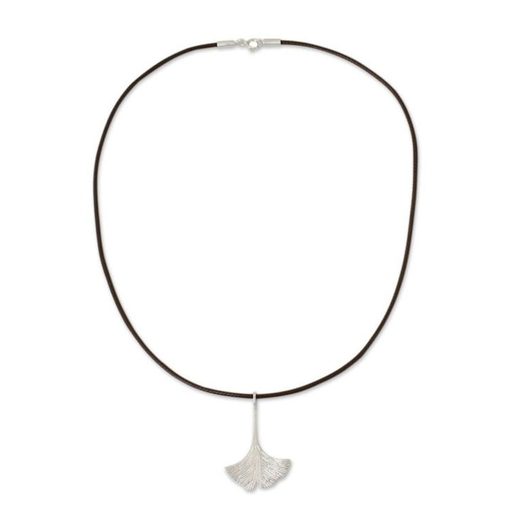 This Handmade Brushed Silver Gingko Leaf Pendant Necklace 'The Gingko' is a graceful and symbolic accessory. Designed by Sarote Lochotinunt, the necklace features a single ginkgo leaf with a distinctive shape. The pendant is crafted from brushed satin sterling silver and suspended from a brown nylon cord. The piece, which reflects a refined balance of strength and artistry, is a beautiful representation of the artisan's heartfelt wish to bring joy to those who wear his jewelry.