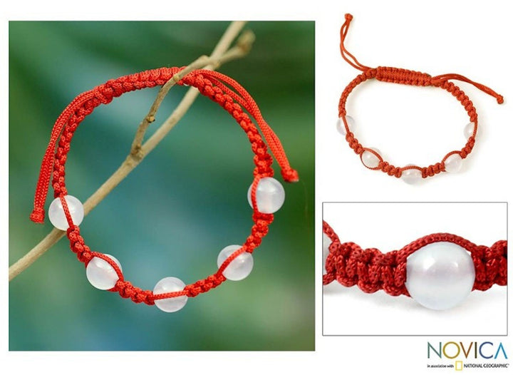 This Handmade Chalcedony Shambhala-style Bracelet 'Peace and Good Fortune' is a symbolic and tranquil accessory. Designed by Hema, this adjustable macrame bracelet features five globes of pink chalcedony. It is a Shambhala-style bracelet, representing tranquility, peace, and happiness. The piece, which honors traditional artistry, is a beautiful representation of the artisan's joy in innovation.