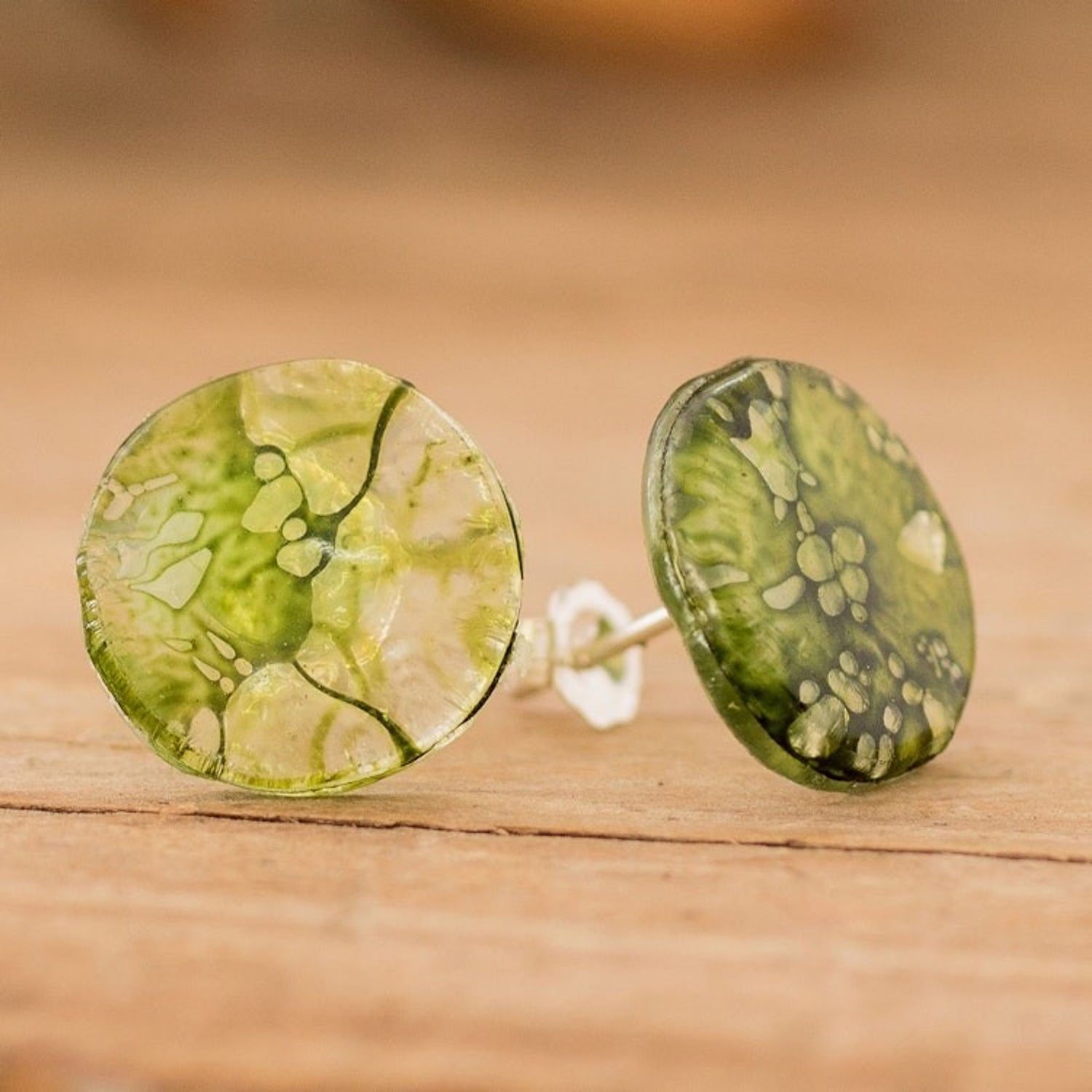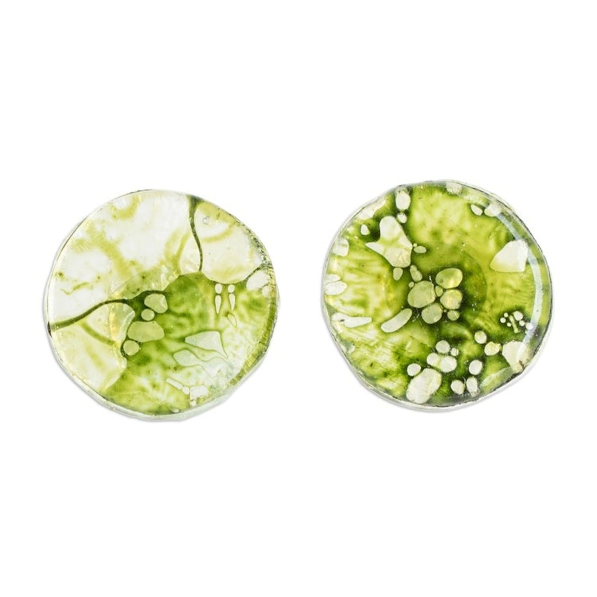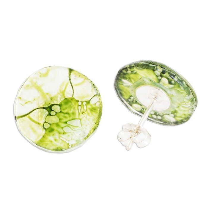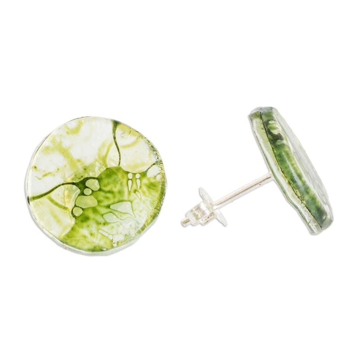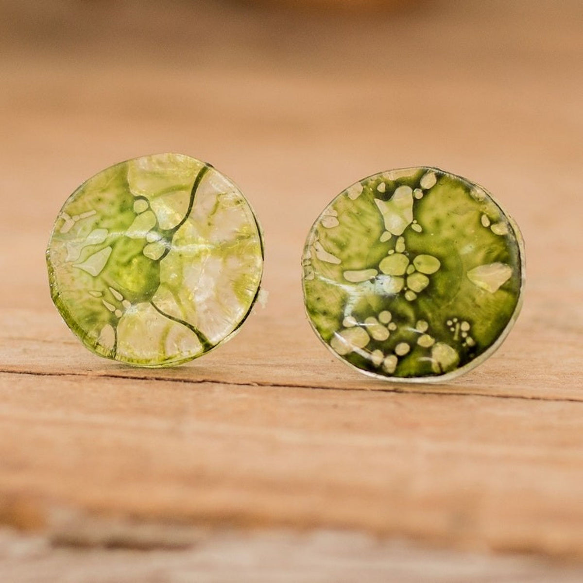 Handmade Eco-Friendly Round Green Recycled CD Stud Earrings 'Garden Translucent Illusion'