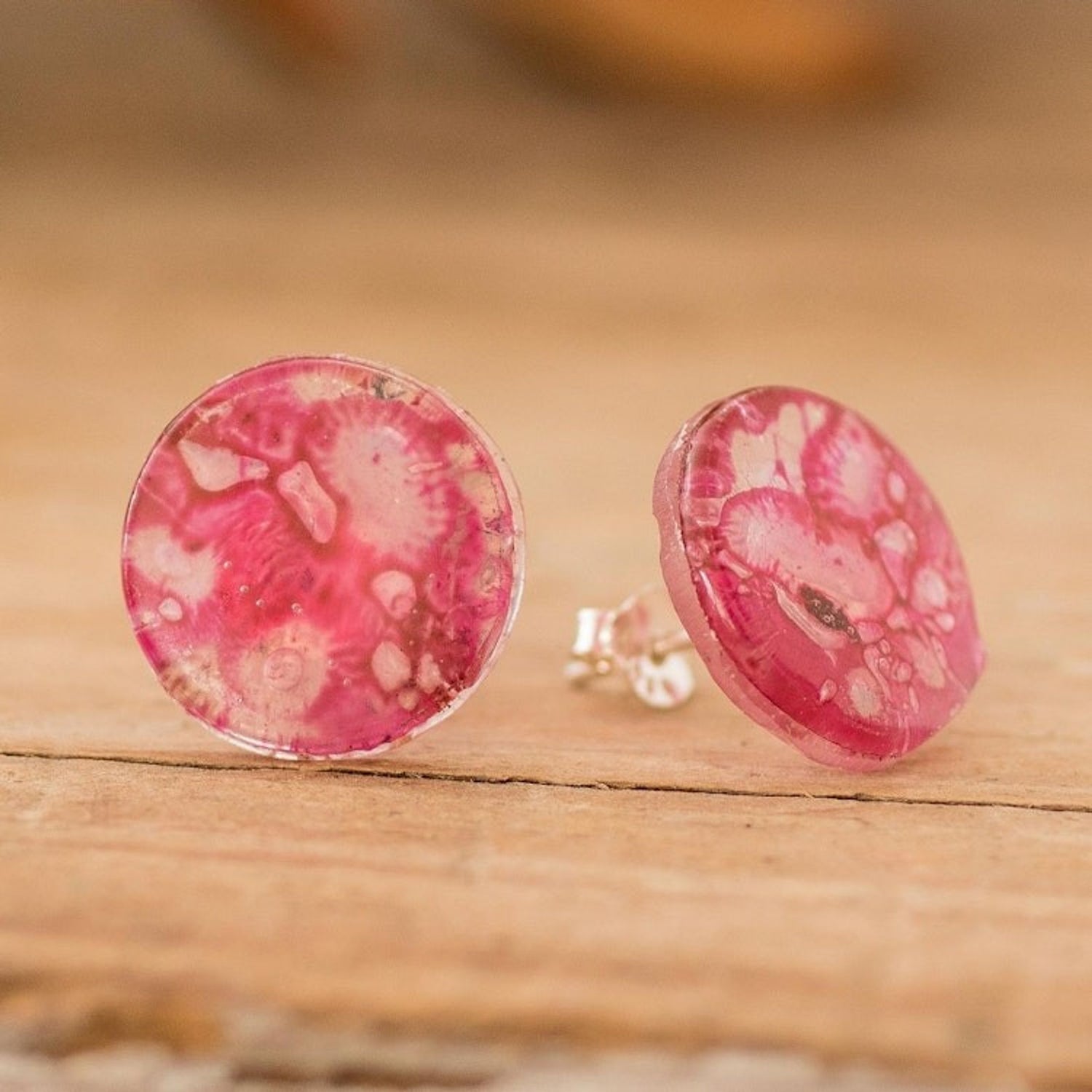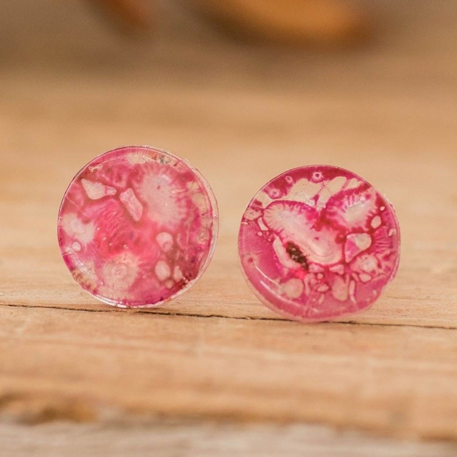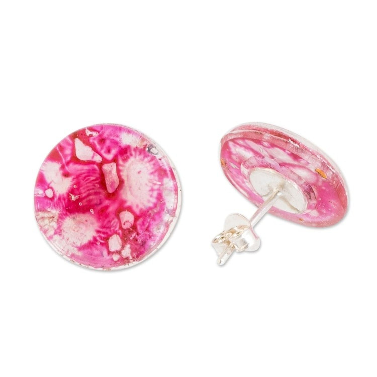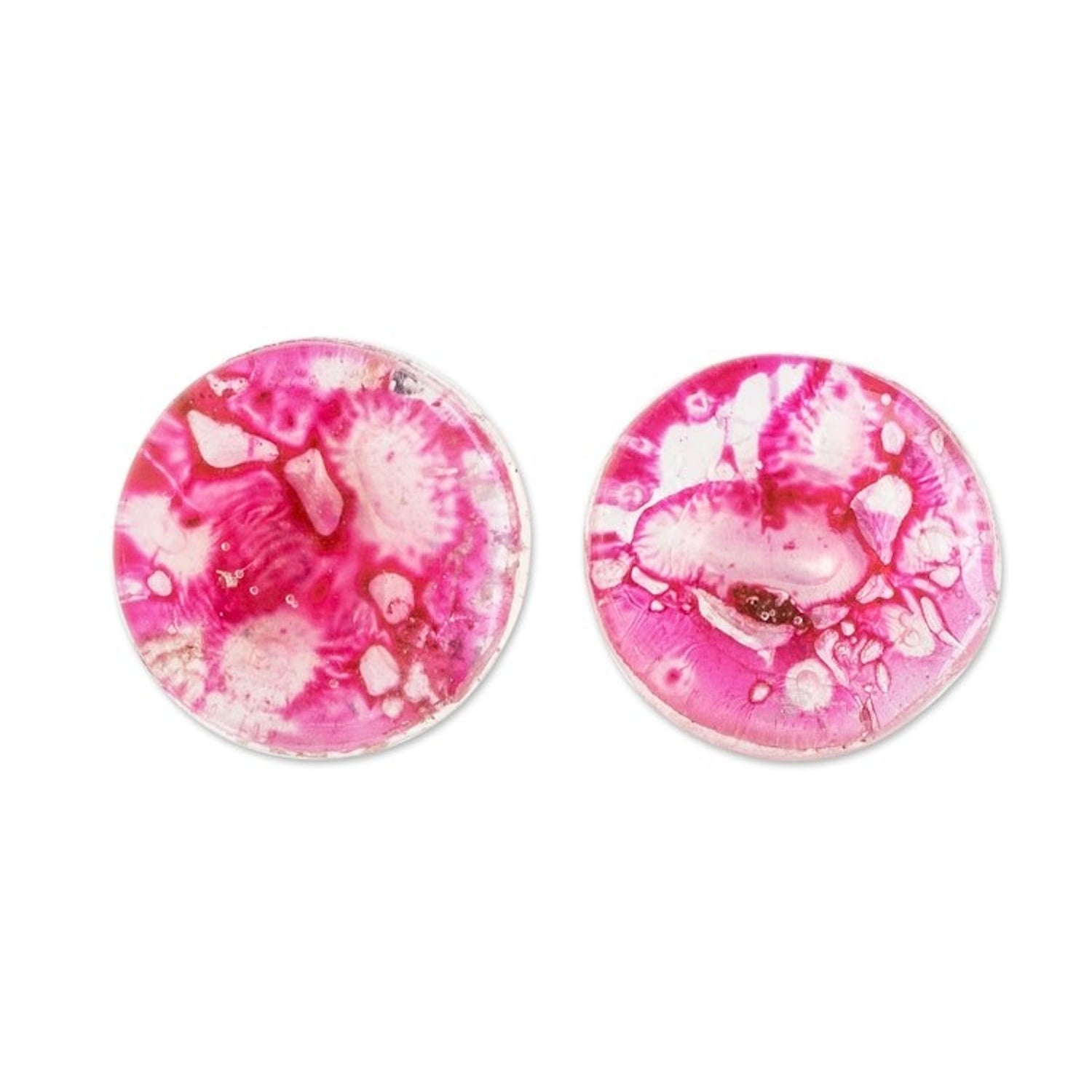 These Handmade Eco-Friendly Round Pink Recycled CD Stud Earrings 'Pink Translucent Illusion' are a sweet and sustainable accessory. Designed by Rosario Leiva, the earrings are crafted by hand from recycled CDs and painted with a sweet pink hue, showcasing a mesmerizing explosion of bubble patterns. The pieces, which turn overlooked objects into wearable statements, are a beautiful representation of the artisan's commitment to sustainability.