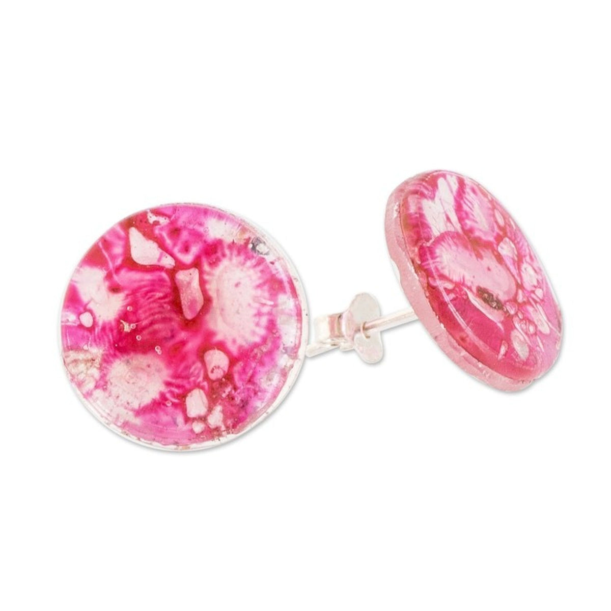 Handmade Eco-Friendly Round Pink Recycled CD Stud Earrings 'Pink Translucent Illusion'