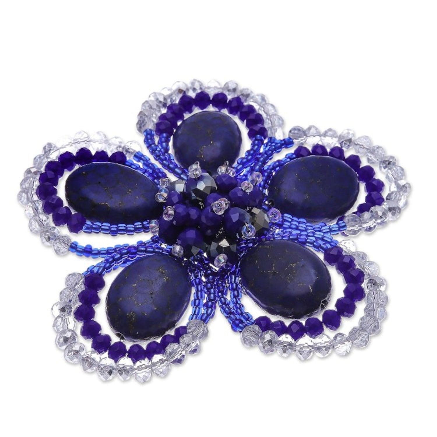 Handmade Floral Dark Blue Howlite and Glass Bead Brooch Pin 'Spring in Dreams'