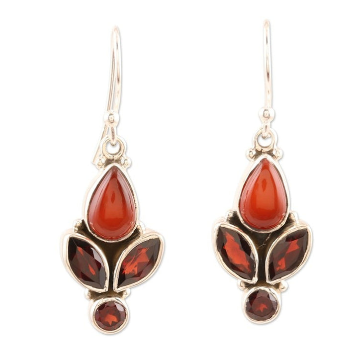 These Handmade Garnet and Carnelian Gemstone Dangle Earrings 'Passionate Red' are a fiery and elegant accessory. Designed by Shanker, these earrings feature a trio of dazzling garnet gemstones beneath a smooth, drop-shaped carnelian gemstone. The flower-shaped quartet of warm-hued gemstones swing from sterling silver hooks. The pieces, which represent perseverance and passion, are a beautiful representation of the artisan's dedication to quality and originality.
