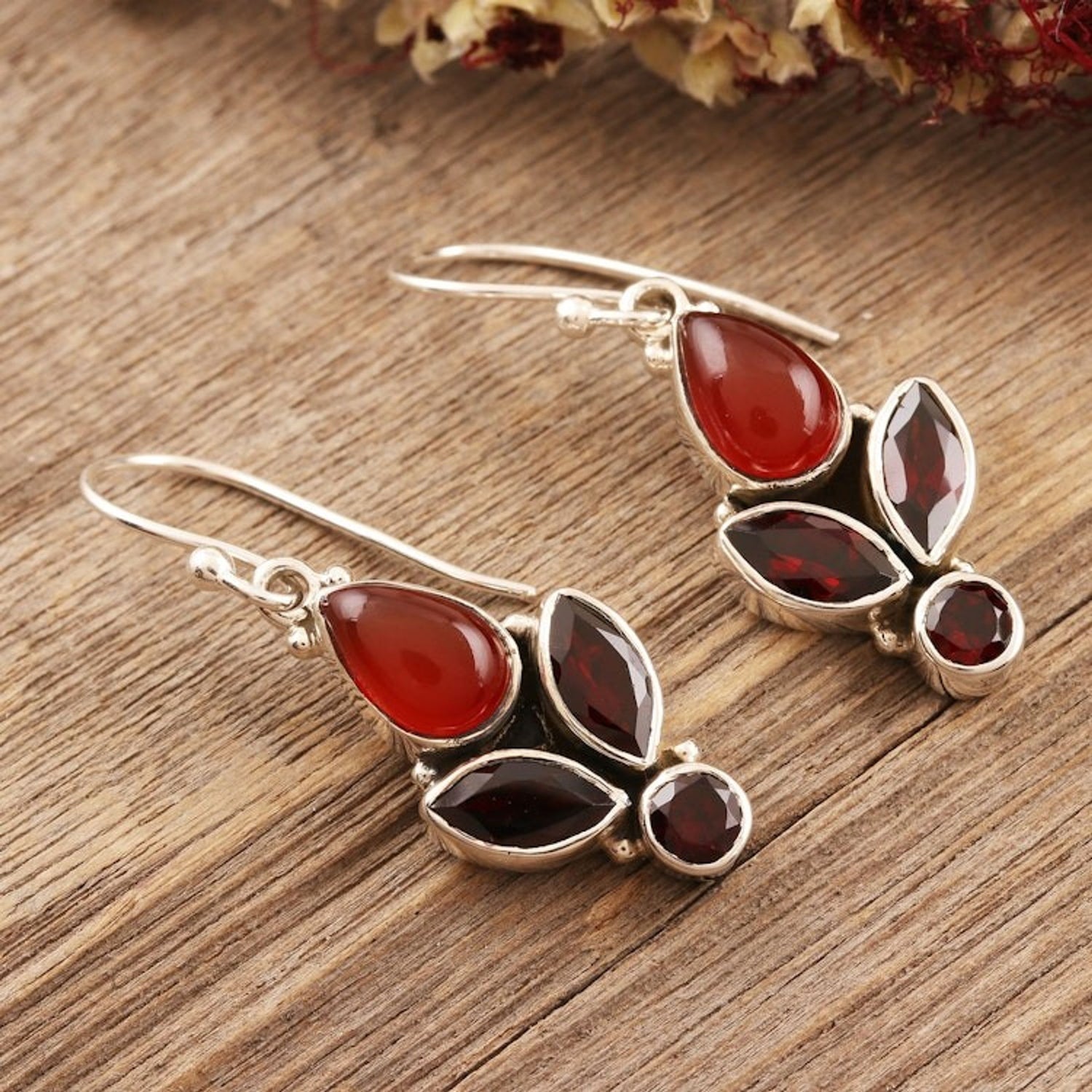 Handcrafted in India with .925 sterling silver, carnelian, and garnet. Each earring measures 1.4 inches in length and 0.5 inches in width. Colors and variegation of the natural stones will vary.
