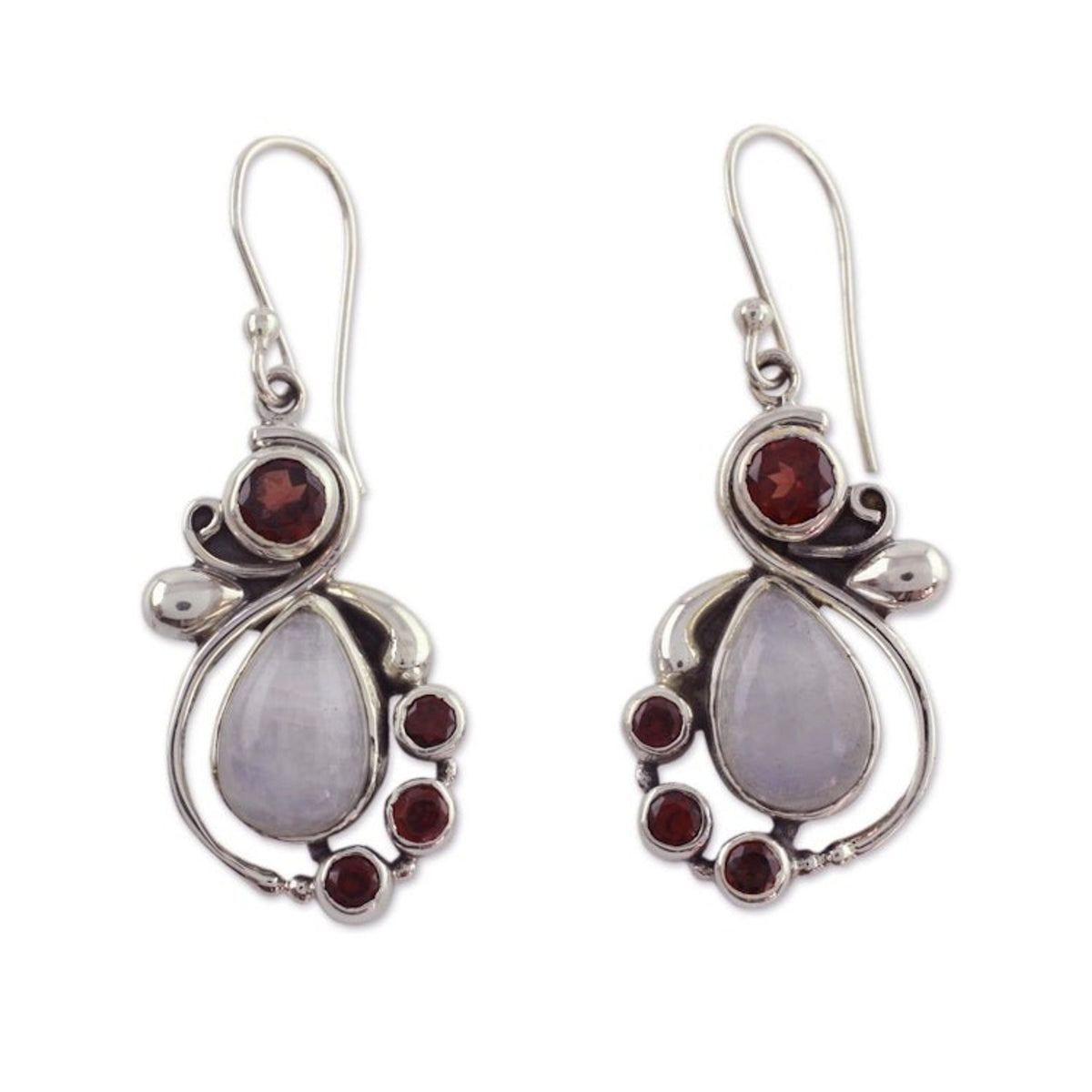 Handcrafted in India with sterling silver, garnet, and rainbow moonstone, these hook earrings have a high-polish finish. Each earring measures 1.7 inches in length and 0.4 inches in width. Inclusions in the gemstones are normal.