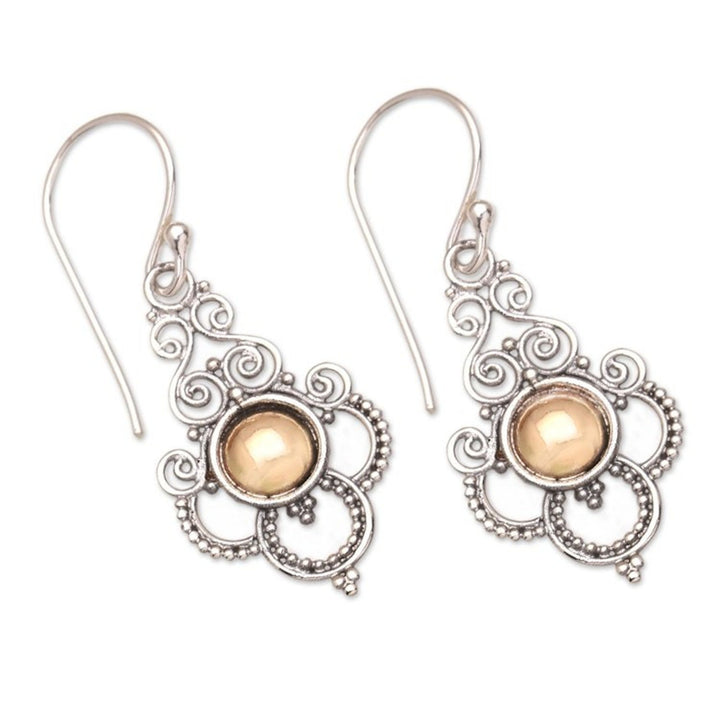 These Handmade Gold-Accented Dangle Earrings from Bali 'Dare to Shine' are a luxe and elegant accessory. Designed by Made Suyana, the earrings feature intricate, openwork sterling silver designs around glowing 18k gold-plated sterling silver circles. The pieces, which reflect both tradition and contemporary appeal, are a beautiful representation of the artisan's dedication to his family and Bali’s silversmithing legacy.