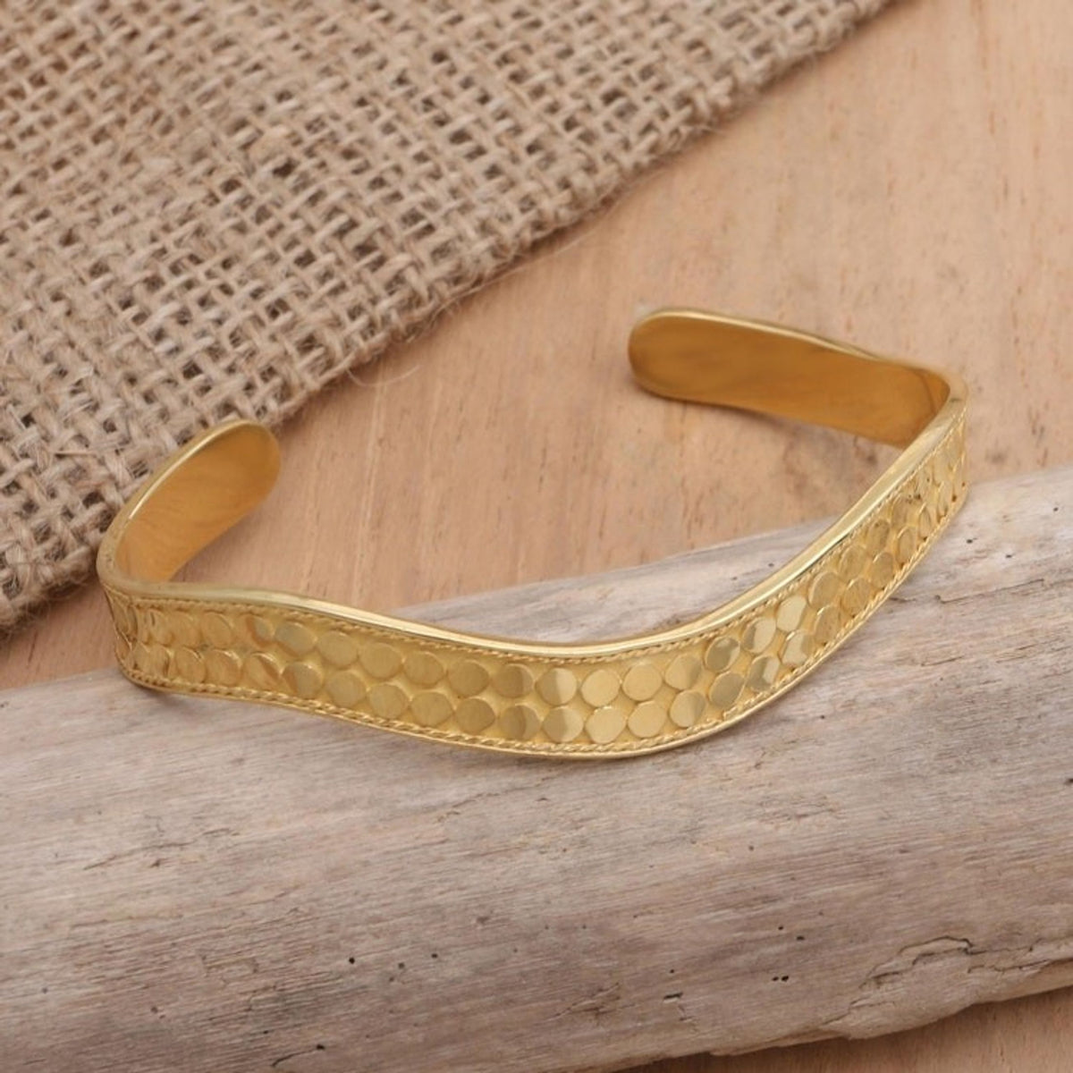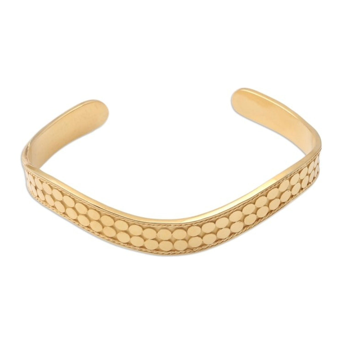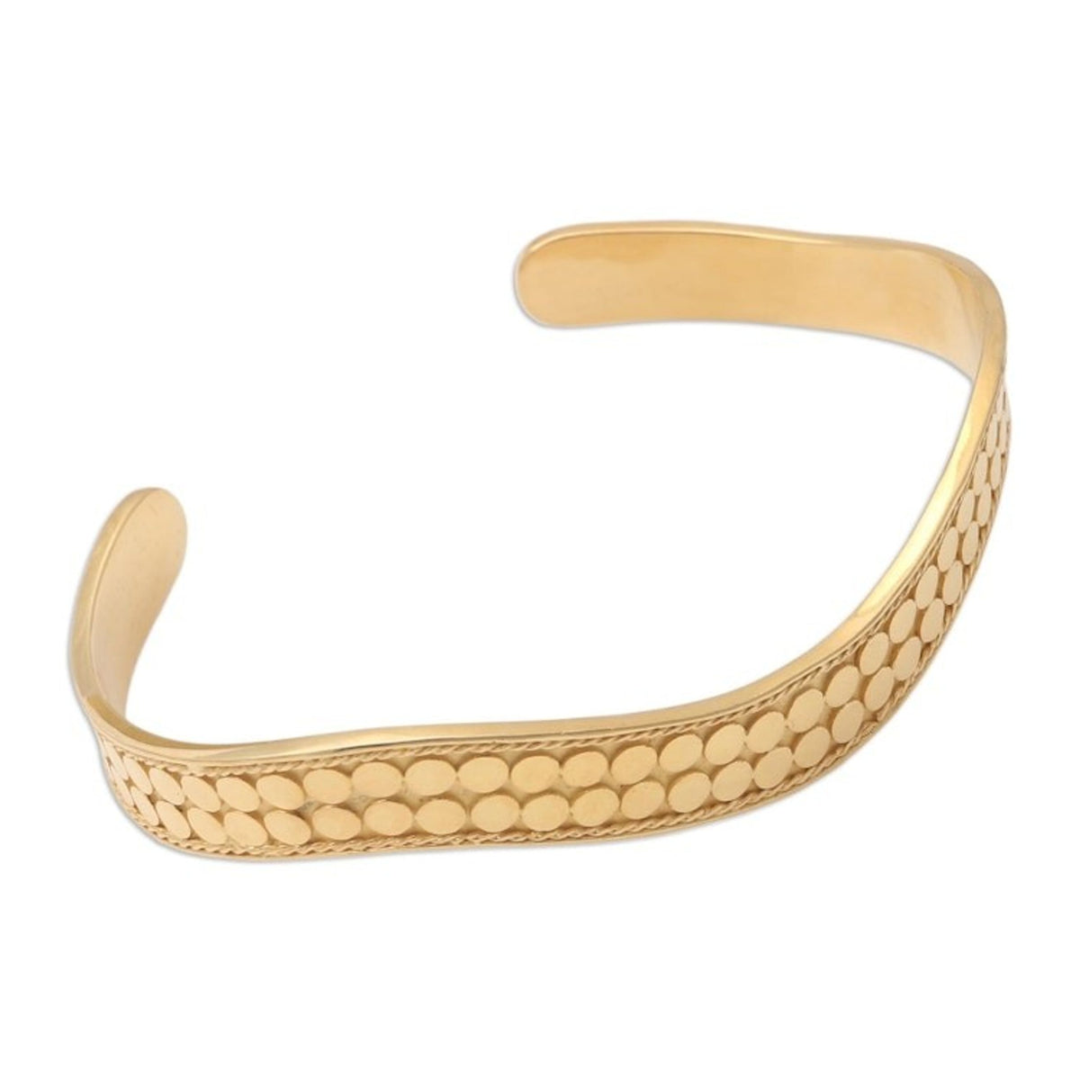 This Handmade Gold-Plated Bangle Bracelet from Bali 'Golden Snake' is a lustrous and textured accessory. Designed by Nyoman Ariawan, the cuff is handcrafted from 18k gold-plated sterling silver and undulates gently like a golden snake. The textured dot motif reflects the light brilliantly. The piece, which blends traditional Balinese motifs with modern techniques, is a beautiful representation of the artisan's dedication to quality and artistry.
