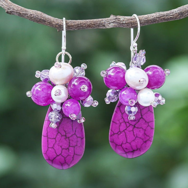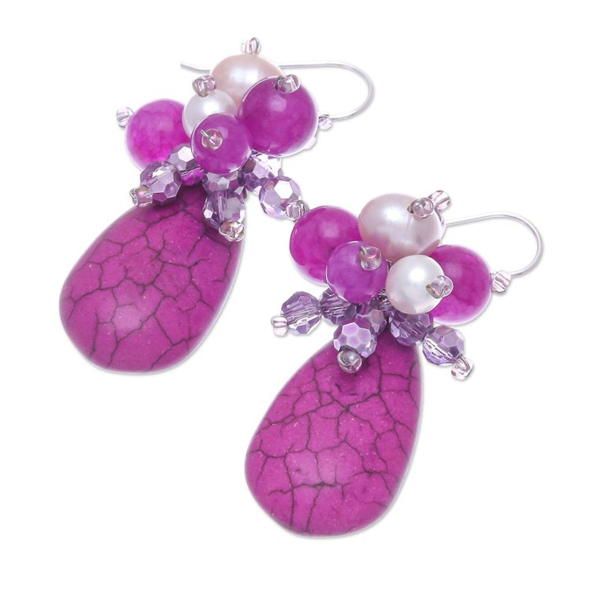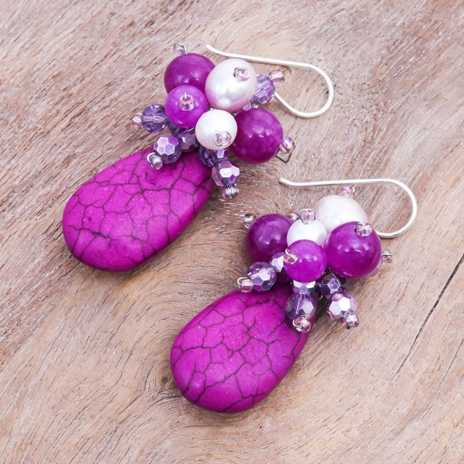 These Handmade Howlite and Cultured Pearl Dangle Earrings 'Space Candy in Fuchsia' are a funky and vibrant accessory. Designed by Nareerat, the earrings feature a long fuchsia howlite gemstone dropping beneath a cluster of colorful beads. The artisan hand-threads quartz and cultured pearls alongside fuchsia glass beads. The pieces, which are a celebration of skill and heritage, are a beautiful representation of the artisan's mission to keep the art of handmade jewelry alive.