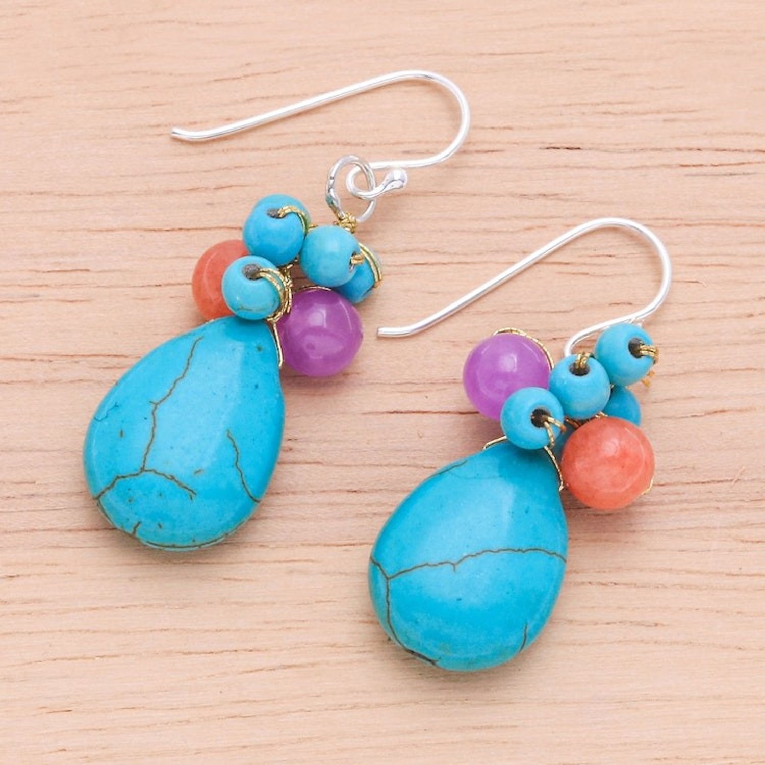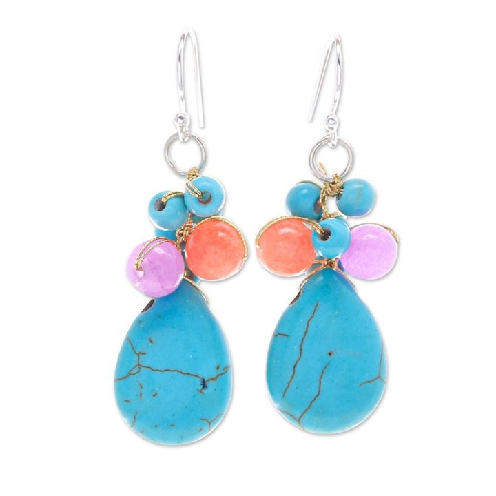 These Handmade Howlite and Quartz Beaded Cluster Dangle Earrings 'Lagoon Drop' are a vibrant and exquisite accessory. Designed by Nareerat, the dangle earrings feature howlite and quartz beads in turquoise, pink, and orange hues, evoking a paradisiacal lagoon. The pieces are joined by metallic threads and finished with shining sterling silver hooks. The earrings, which are a celebration of skill and heritage, are a beautiful representation of the artisan's mission to keep the art of handmade jewelry alive.