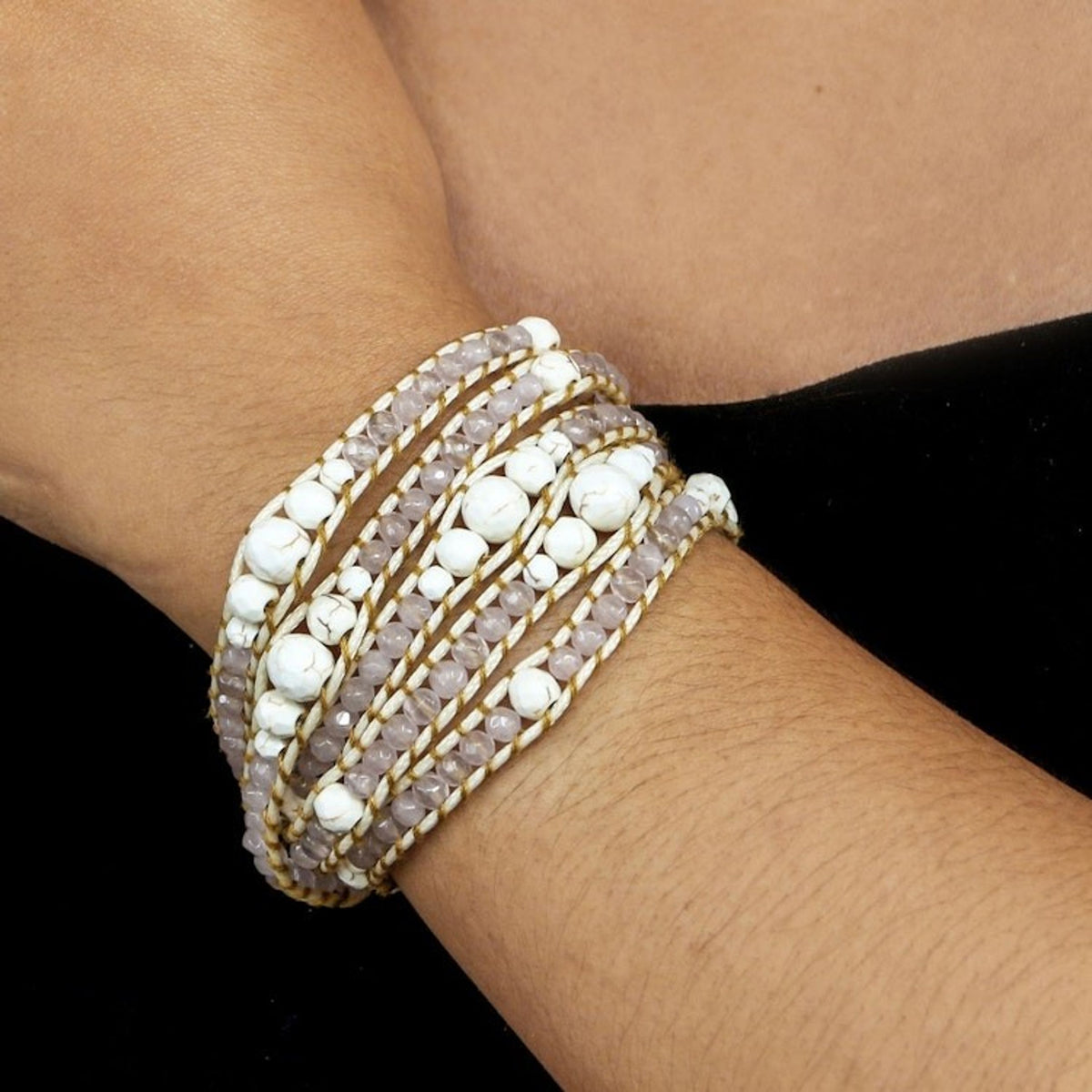 This Handmade Howlite and Rose Quartz Beaded Wrap Bracelet 'Baby Cheeks' is a versatile and beautiful accessory. Designed by Ayu Widiani, the wrap bracelet is hand-threaded with howlite and blushing rose quartz beads on a strong cotton cord. The piece wraps multiple times around the wrist and fastens with a sterling silver button clasp. The bracelet, which supports women artisans, is a beautiful representation of the artisan's commitment to her family business rooted in artistry and community.