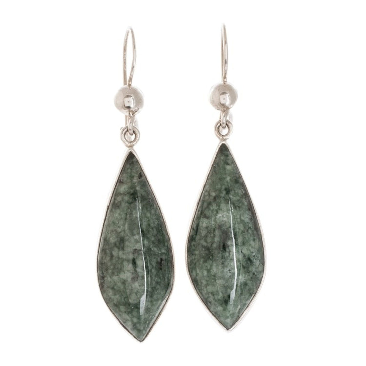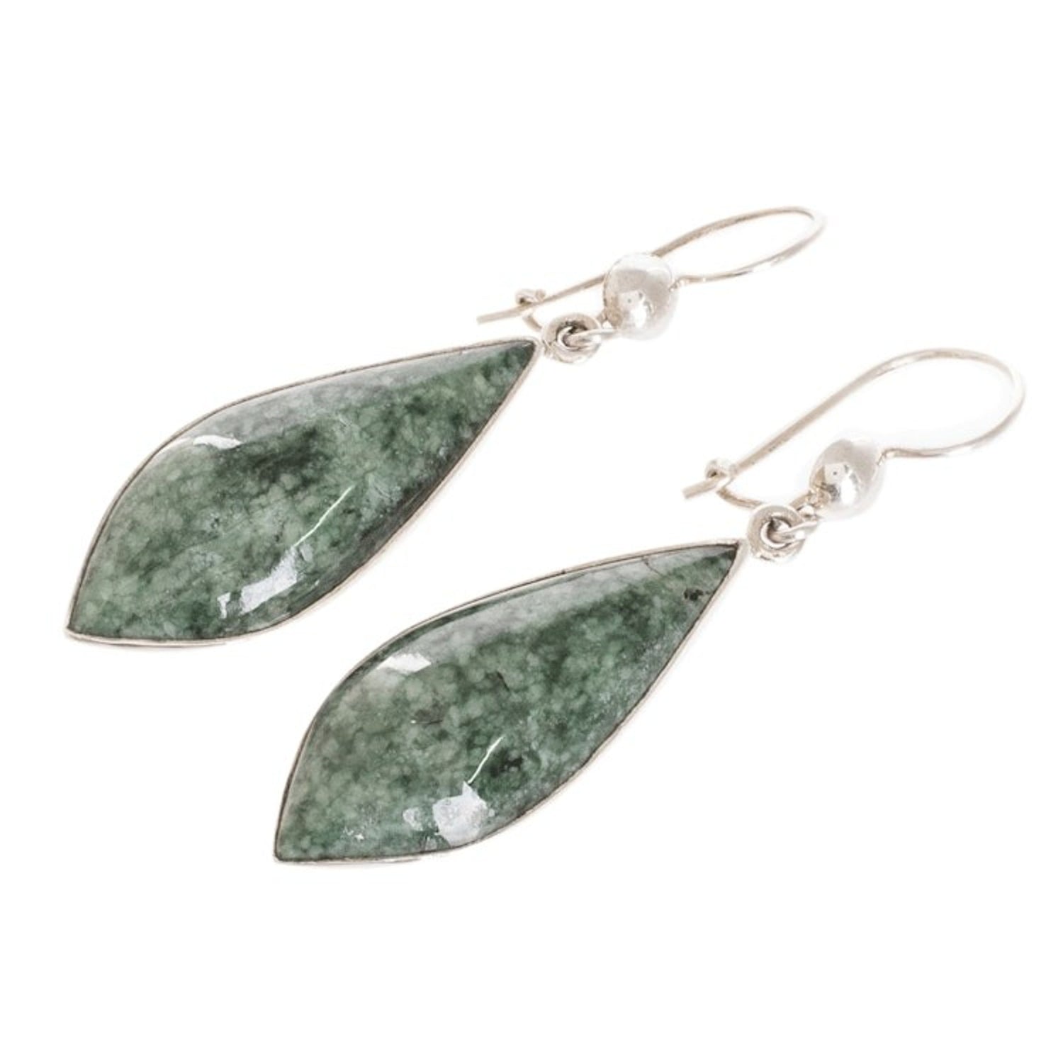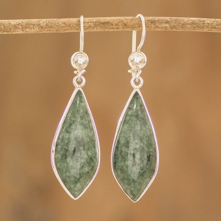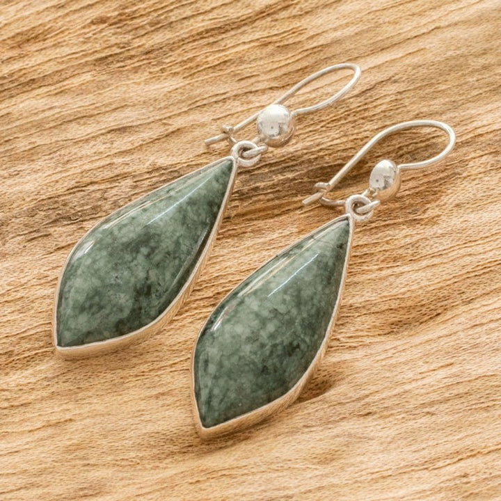 Handcrafted in Guatemala with .925 sterling silver and jade. Each earring measures 1.9 inches in length and 0.5 inches in width. Natural stone color and variegation are expected to vary.