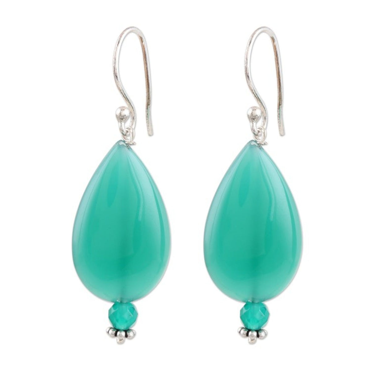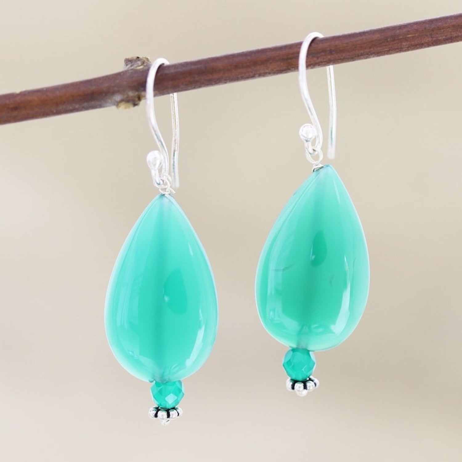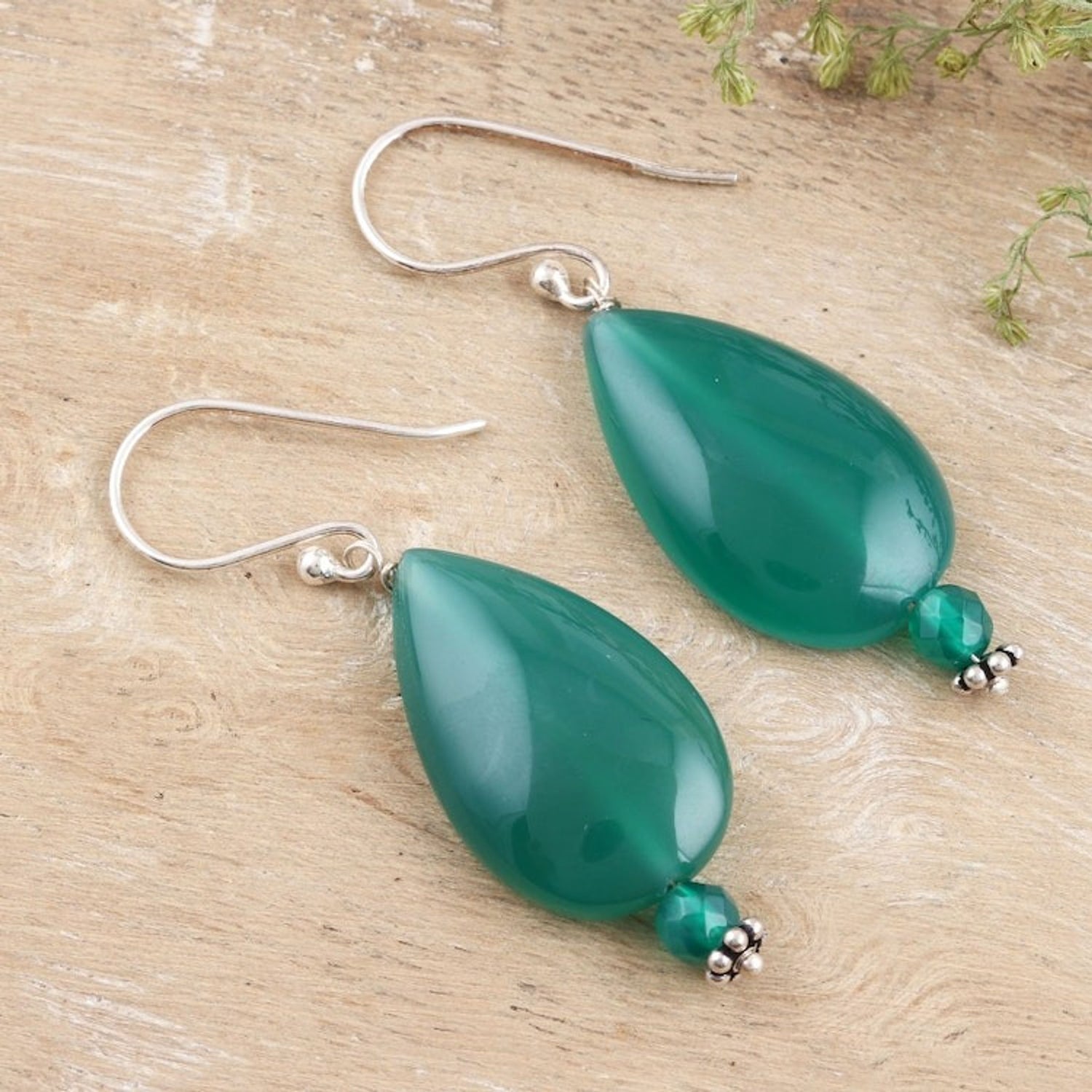 These Handmade Onyx and Sterling Silver Dangle Earrings 'Verdant Garden' are a lovely and elegant accessory. Designed by Narayani, the earrings feature smooth, drop-shaped green onyx beads hanging from gleaming sterling silver hooks. Tiny green onyx beads hang below, accented by sterling silver dot work. The pieces, which reflect both heritage and discovery, are a beautiful representation of the artisan's commitment to uncovering one’s true passions.
