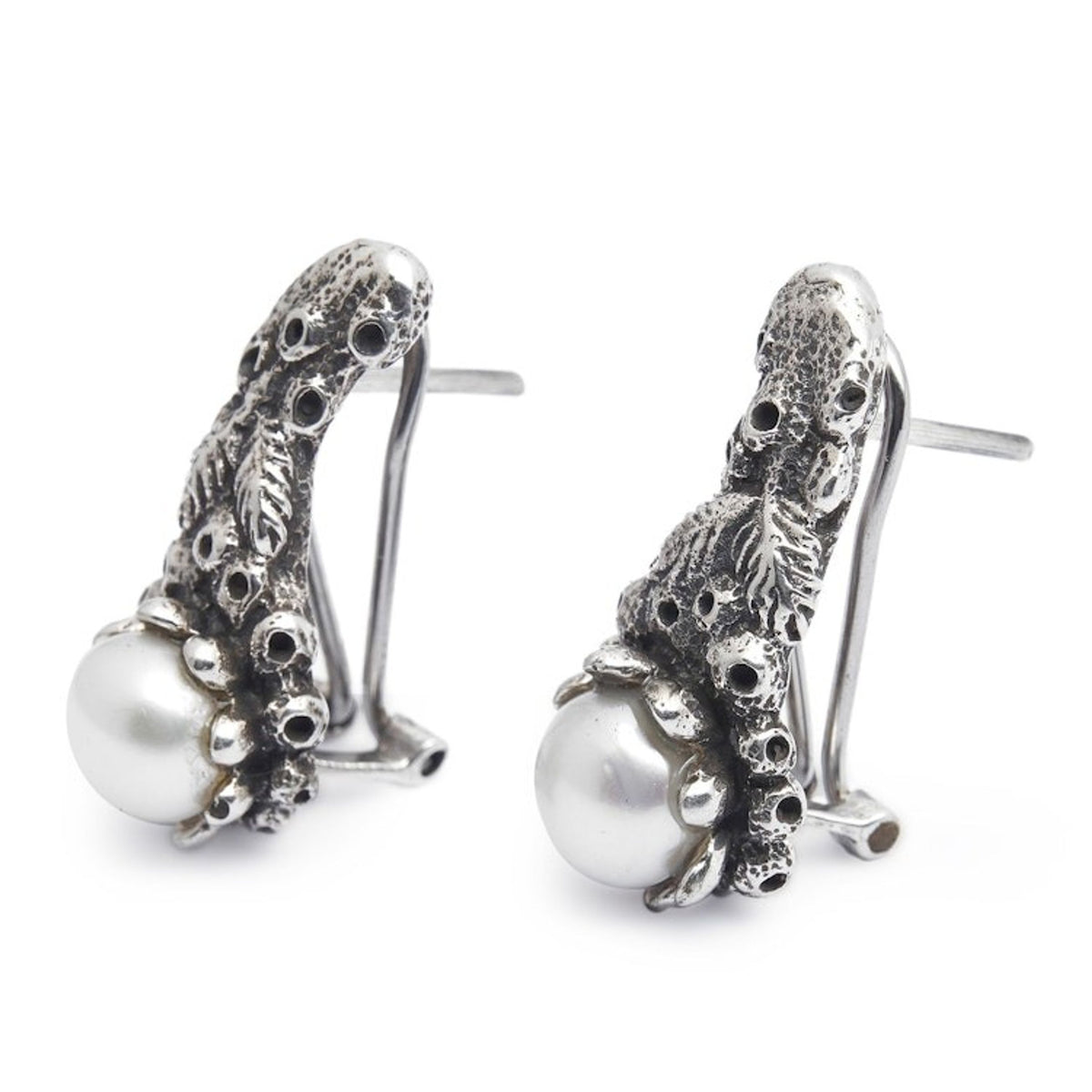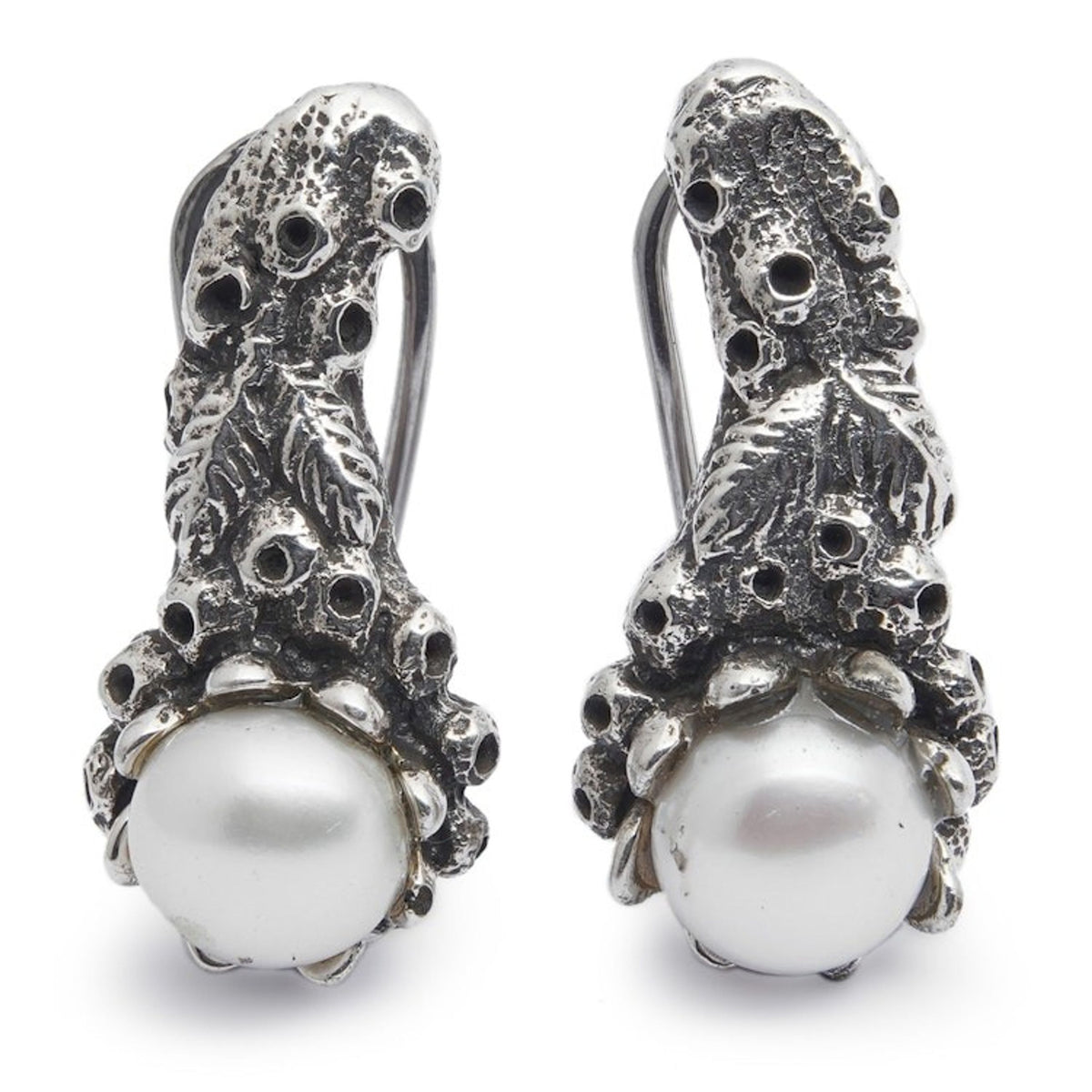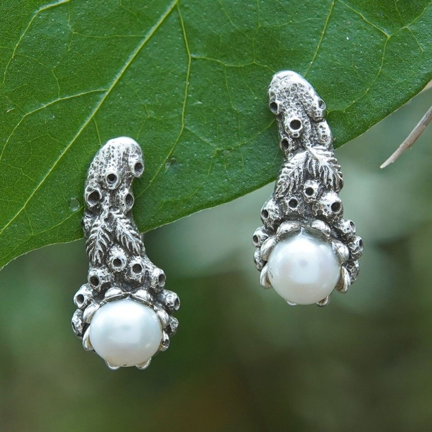 These Handmade Pearl and Silver Drop Earrings 'Coral Reef' are an original and luminous accessory. Designed by Nyoman Rena, the earrings emulate the fascination of a coral reef and are crafted in sterling silver with luminous white cultured freshwater pearls. The pieces, which capture both Balinese heritage and contemporary design, are a beautiful representation of the artisan's dedication to his craft.