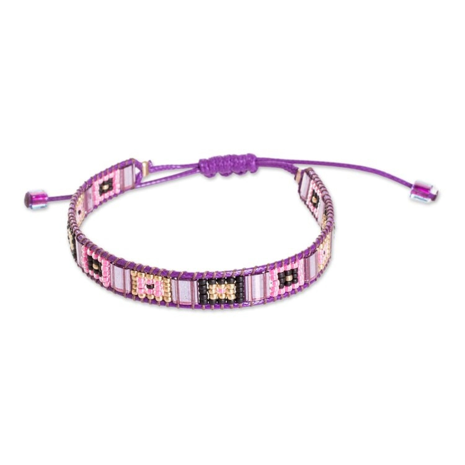This Handmade Purple and Pink Glass Beaded Wristband Bracelet 'Geometric Delight' is a delightful and colorful accessory. Designed by the Hands of Atitlán collective, the wristband is skillfully assembled from a rainbow of glass beads in purple, pink, black, and gold. The bracelet is anchored by a purple cord and has an adjustable sliding knot closure. The piece, which reflects natural beauty and cultural richness, is a beautiful representation of the artisan's mission to uplift women and strengthen communities.