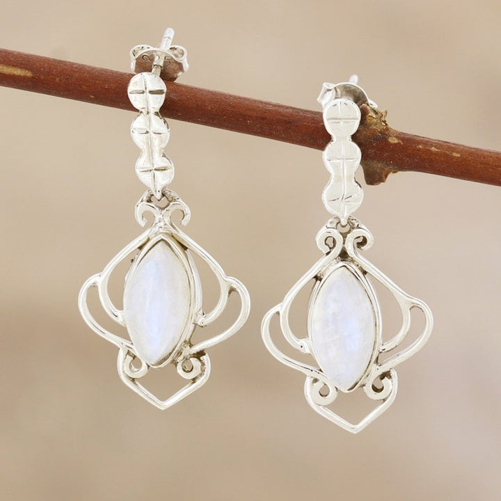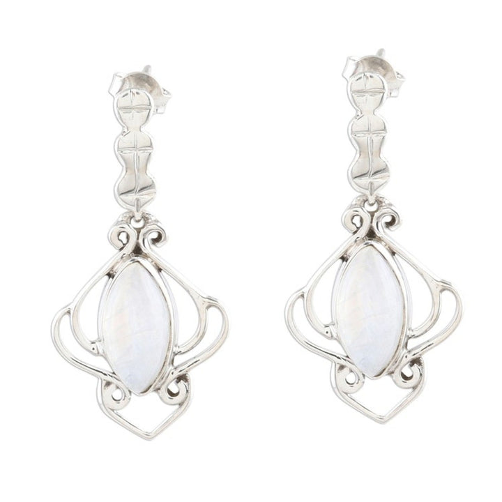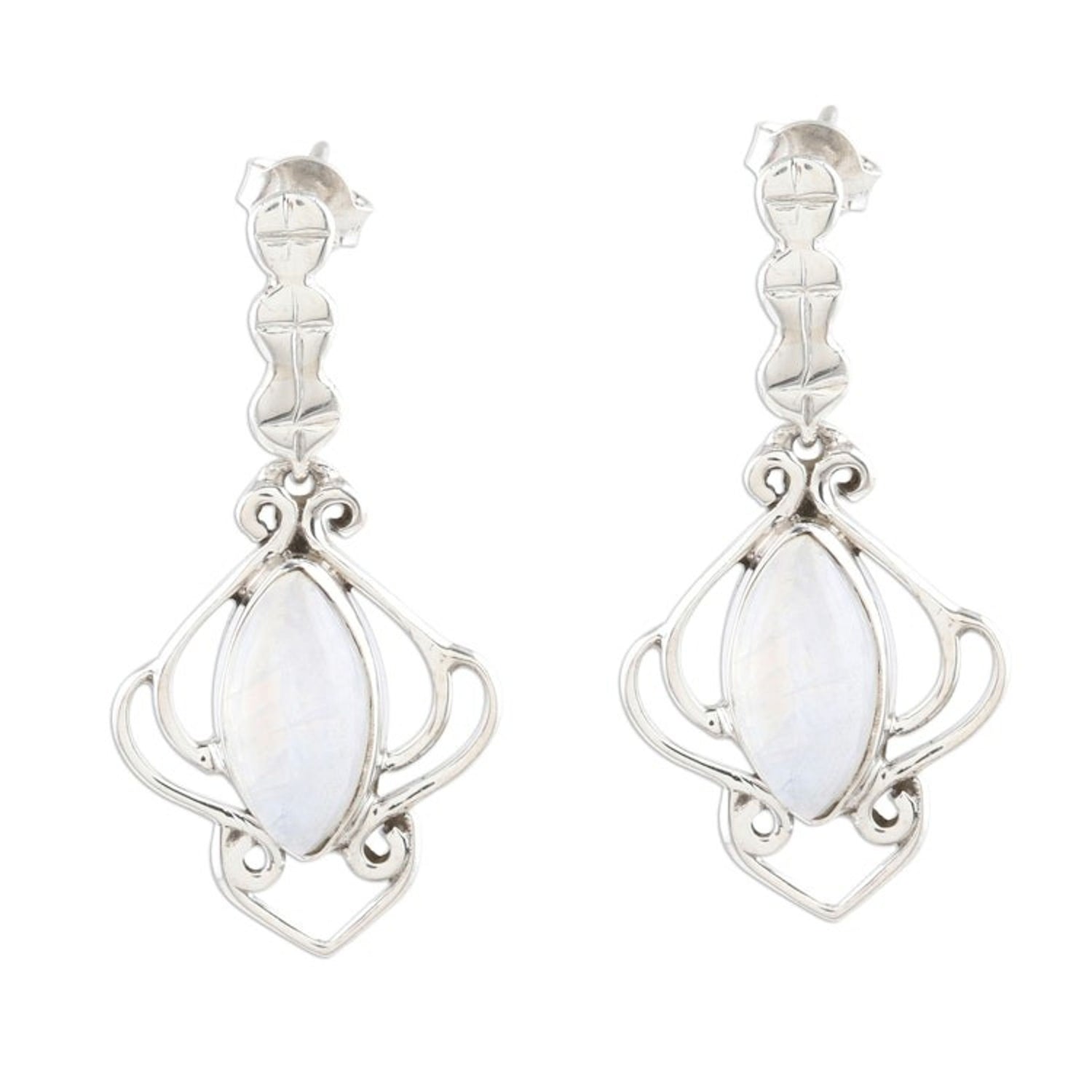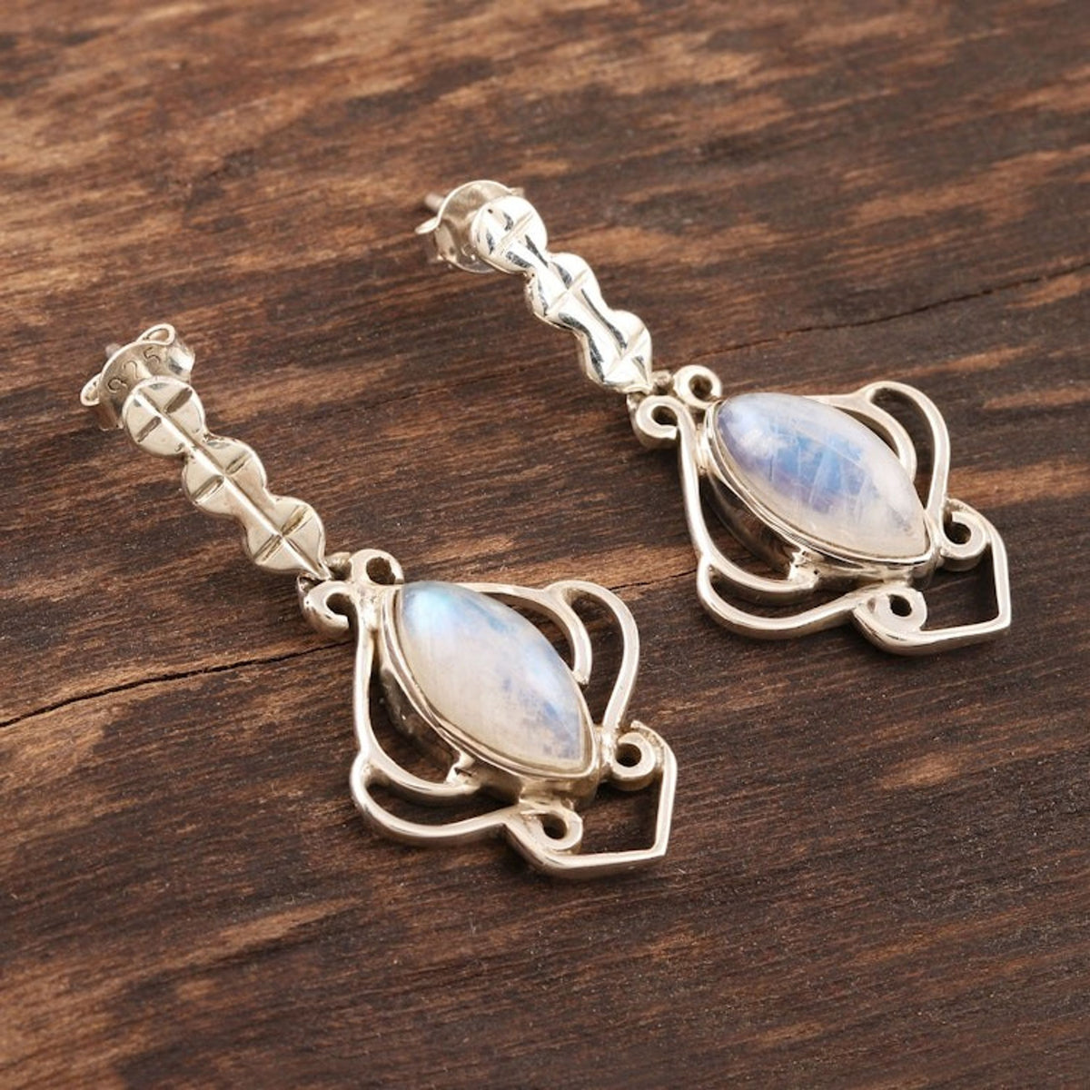 These Handmade Rainbow Moonstone Dangle Earrings 'Rain Goddess' are an elegant and luminous accessory. Designed by Rakesh Rana, the earrings feature polished cabochons of rainbow moonstone framed in sterling silver and poised on sterling silver posts. The pieces, which blend tribal, traditional, and contemporary aesthetics, are a beautiful representation of the artisan's dedication and cultural richness.