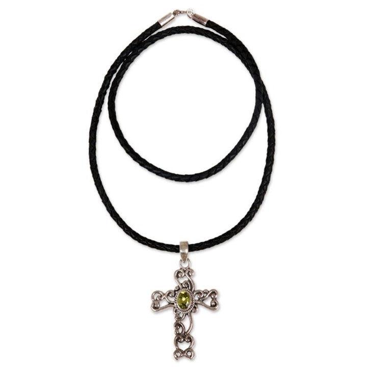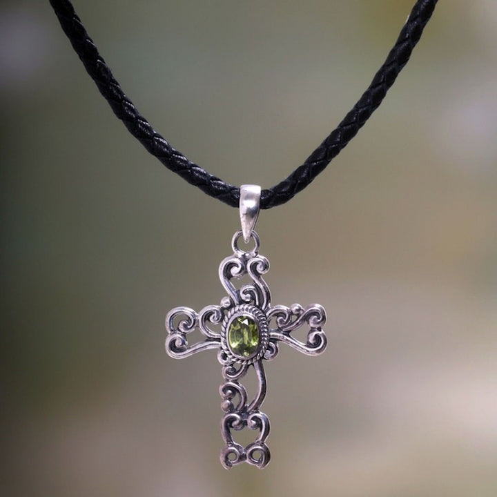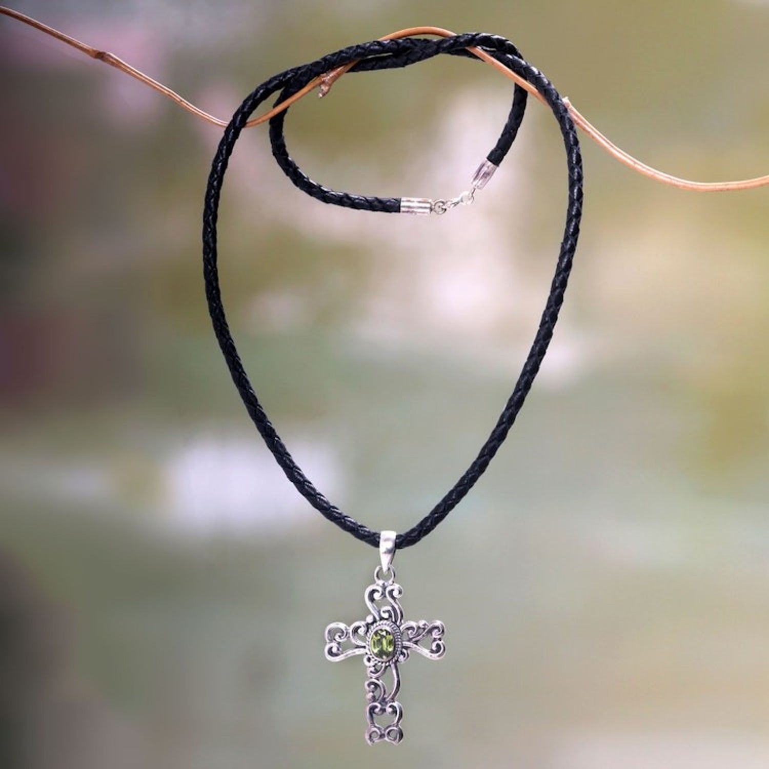 This Handmade Religious Peridot Necklace 'Balinese Cross' is an intricate and beautiful accessory. Designed by Kenari, the necklace features a sterling silver cross with gleaming tendrils that evoke the floral wealth of the island. It is centered with an oval green peridot and worn on a braided leather necklace. The piece, which balances tradition with innovation, is a beautiful representation of the artisan's dedication and precision.
