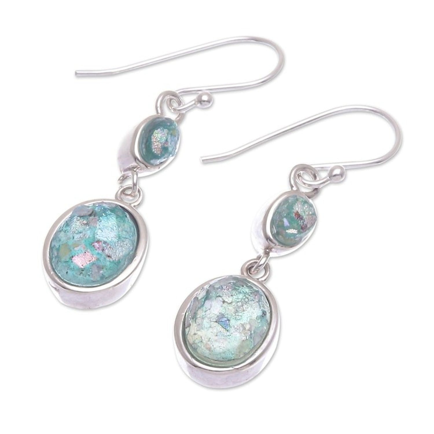 These Handmade Roman Glass Dangle Earrings 'Spring Showers' are an original and historic accessory. Designed by Michael Krainer, the earrings are crafted from ancient Roman glass, which is recovered from archaeological dig sites up to 2,000 years old. Sterling silver accents complement the iridescent glass perfectly. The pieces, which combine tradition with innovation, are a beautiful representation of the artisan's commitment to artistry and soul.