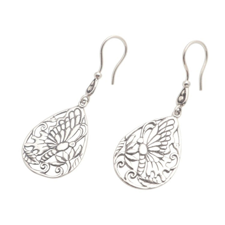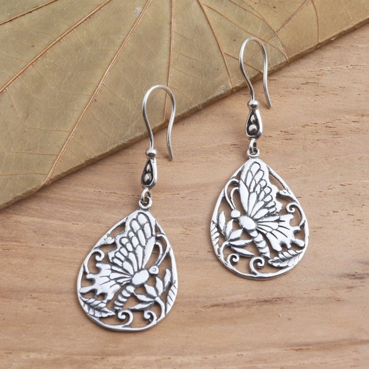 These Handmade Silver Butterfly Dangle Earrings 'Butterfly Breeze' are graceful and original accessories. Designed by Nyoman Ariawan, the earrings are crafted from sterling silver with beautiful detail. The pieces, which blend traditional Balinese motifs with modern techniques, are a beautiful representation of the artisan's dedication to quality and artistry.