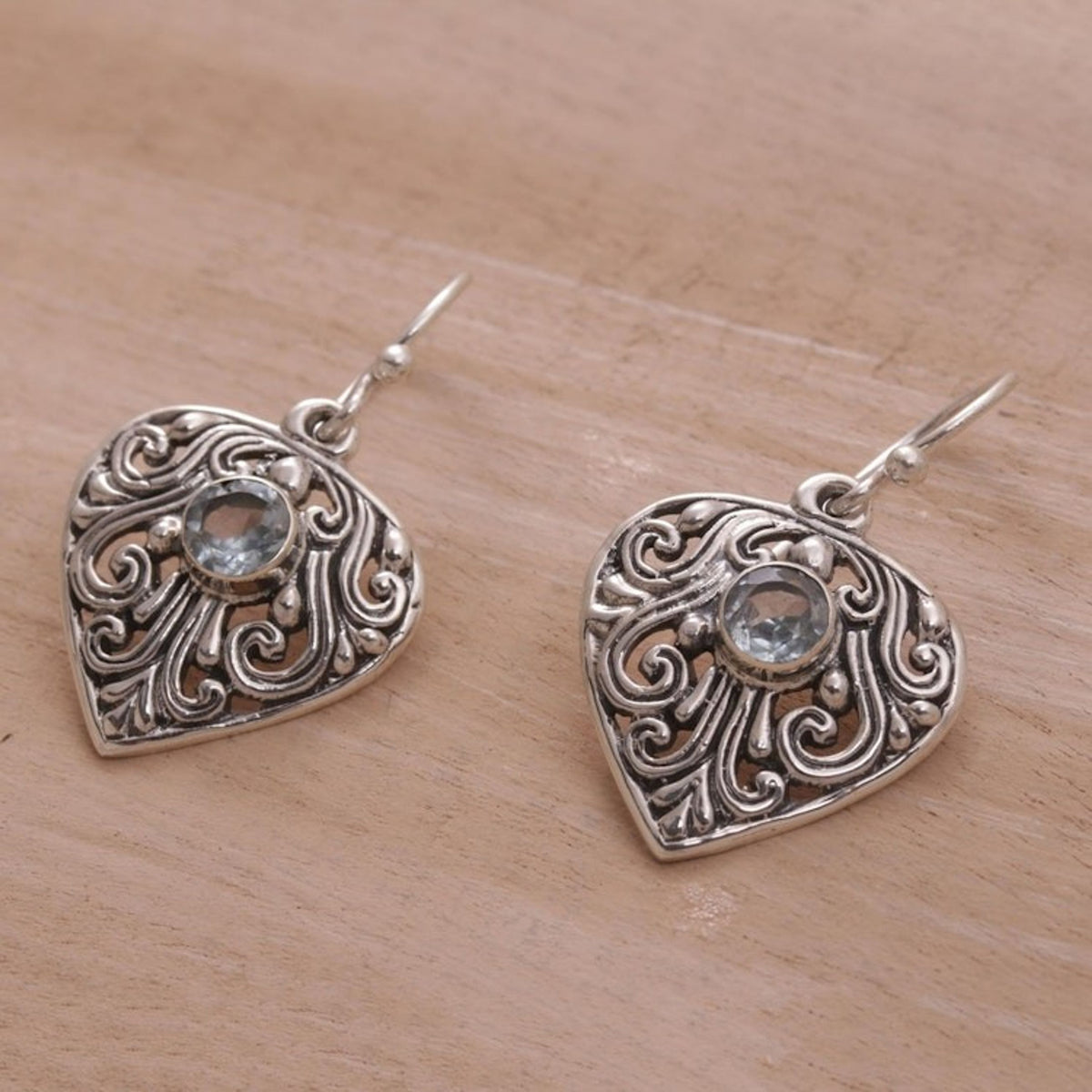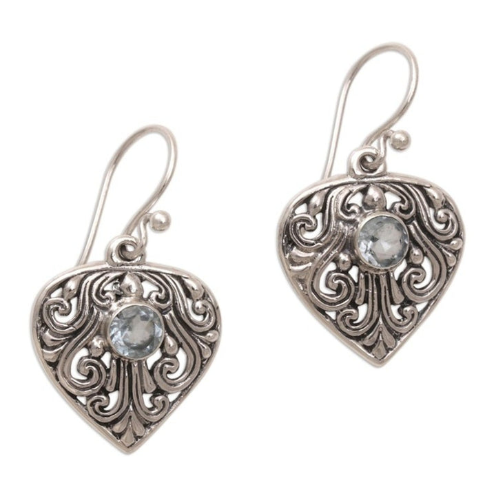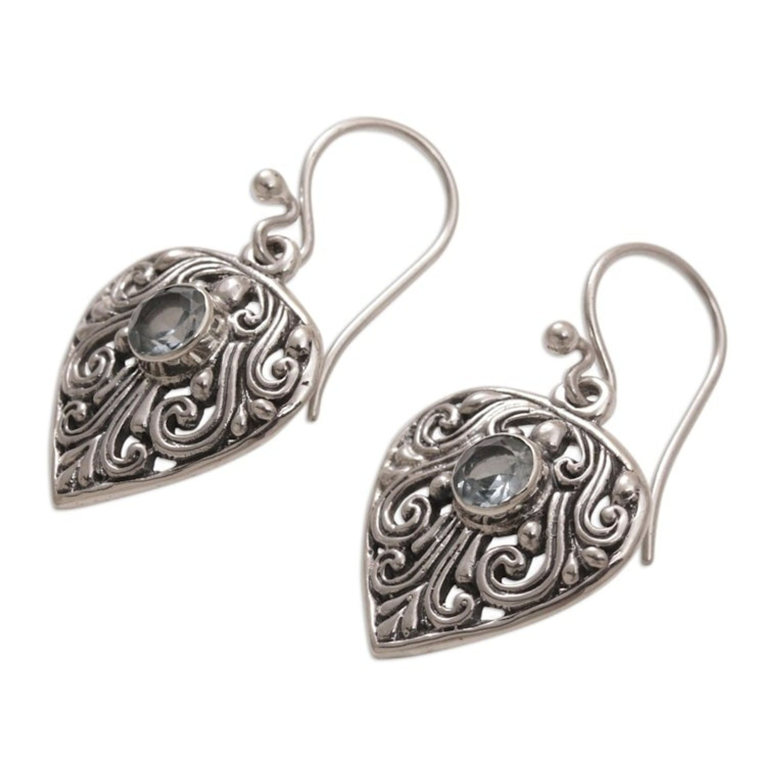 These Handmade Sterling Silver and Blue Topaz Dangle Earrings 'Crest of Vines' are an exquisite and dazzling accessory. Designed by Kadek Suar Dwipayana, the intricate earrings are crafted from sterling silver with swirling vine motifs. They are centered with blue topaz totaling one carat. The pieces, which honor Bali’s heritage while reflecting the artisan's creativity, are a beautiful representation of his dedication to his craft.