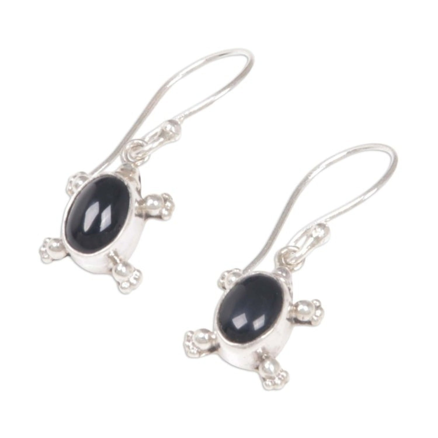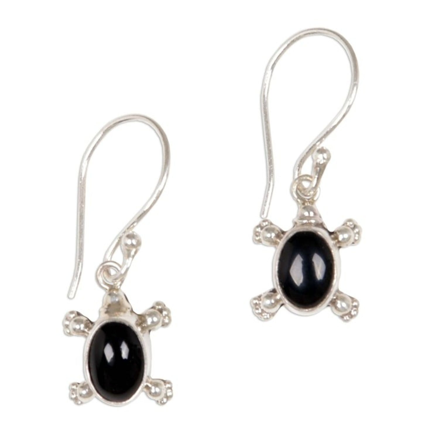 These Handmade Sterling Silver and Onyx Dangle Earrings 'Turtle Trails' are an endearing and unique accessory. Designed by Nyoman Sukartini, the earrings feature sterling silver turtles with onyx shells. The pieces, which honor Bali's cultural beauty, are a beautiful representation of the artisan's way of sharing her culture with the world.