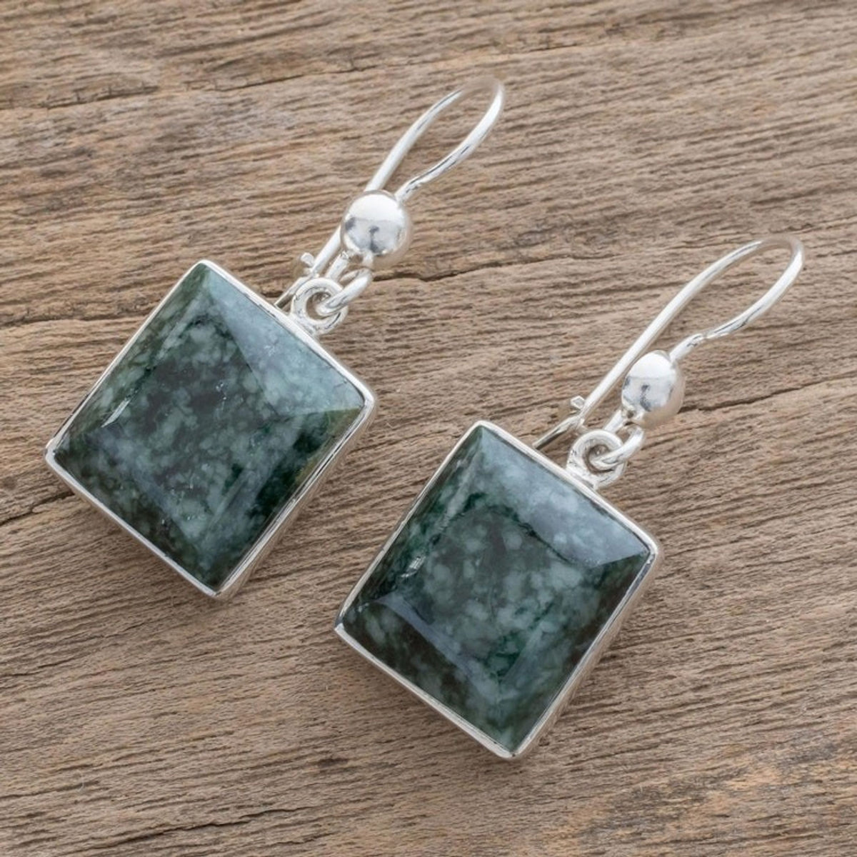 These Handmade Sterling Silver Dangle Jade Earrings 'Love Immortal' are a meaningful and beautiful accessory. Designed by the Jimenez Family, the earrings feature squares of natural jade, a stone regarded as more valuable than gold by the Aztec and Maya, in sterling silver encasings. The pieces, which combine artistry with sustainability, are a beautiful representation of the family's resilience and determination.