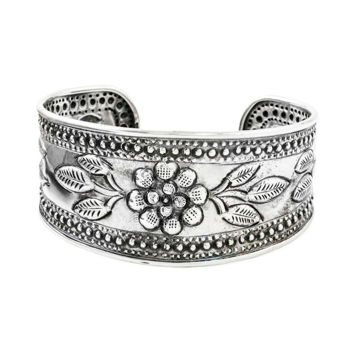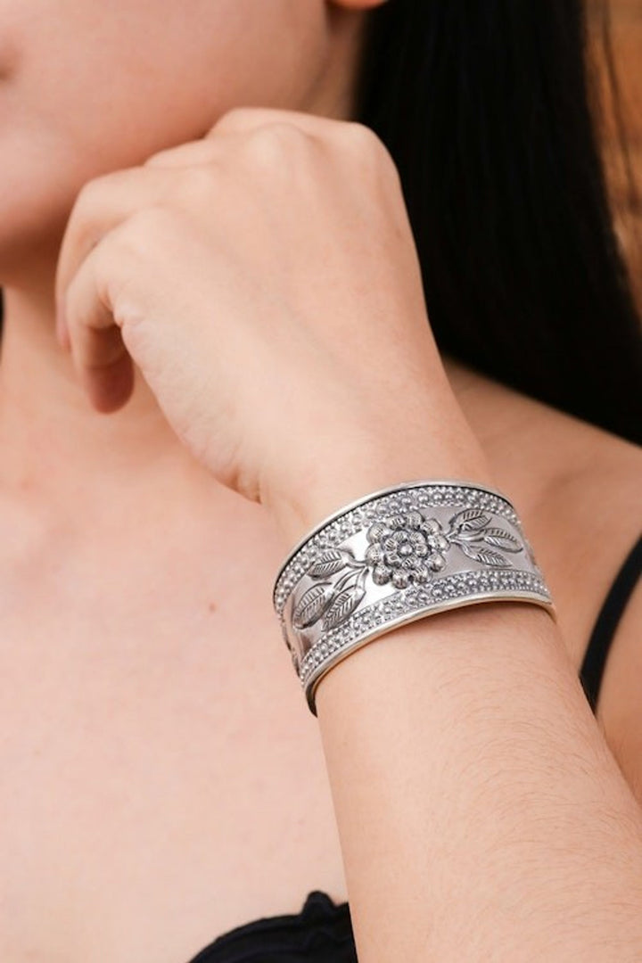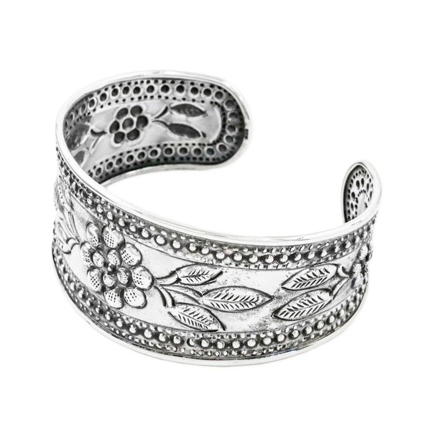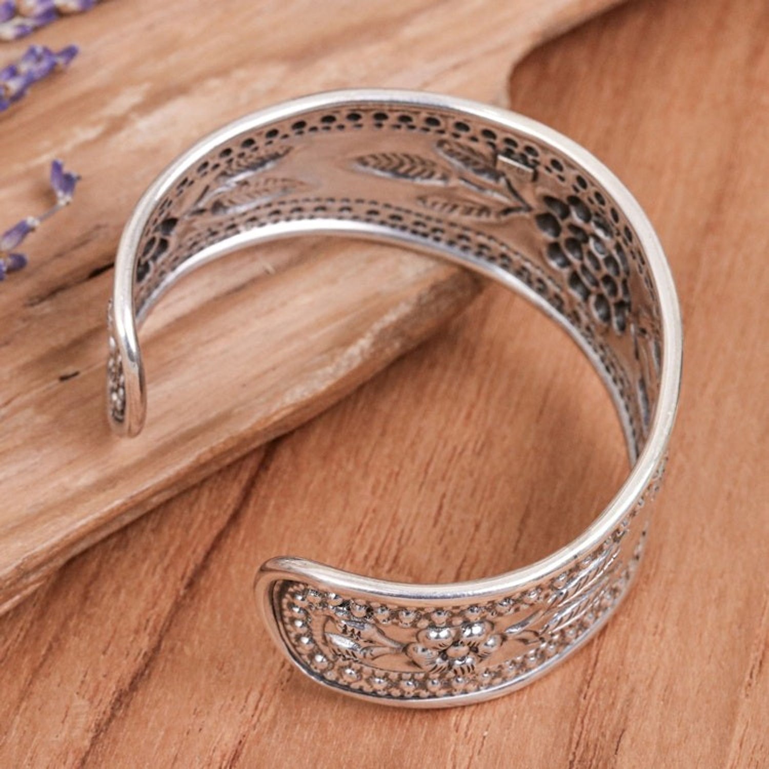 This Handmade Sterling Silver Floral Cuff Bracelet from Thailand 'Pleasure in Paradise' is a stunning and expertly crafted accessory. Designed by Achara, the cuff bracelet is handcrafted with leafy blossoms that dance around it and is engraved with expert craftsmanship. The piece, which bridges heritage and contemporary elegance, is a beautiful representation of the artisan's mission to sustain Thai and hill tribe culture.