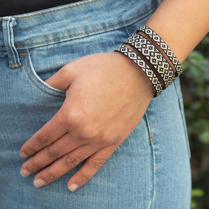 This Handmade Woven Cuff Bracelet 'Dark Bird' is a fabulous and cultural accessory. Crafted by artisans of the Zenú Community, the wide cuff is woven with caña flecha fibers in espresso and ivory, creating the illusion of three bracelets. The piece, which preserves ancestral techniques and carries symbolic meaning, is a beautiful representation of the community's identity and living tradition.