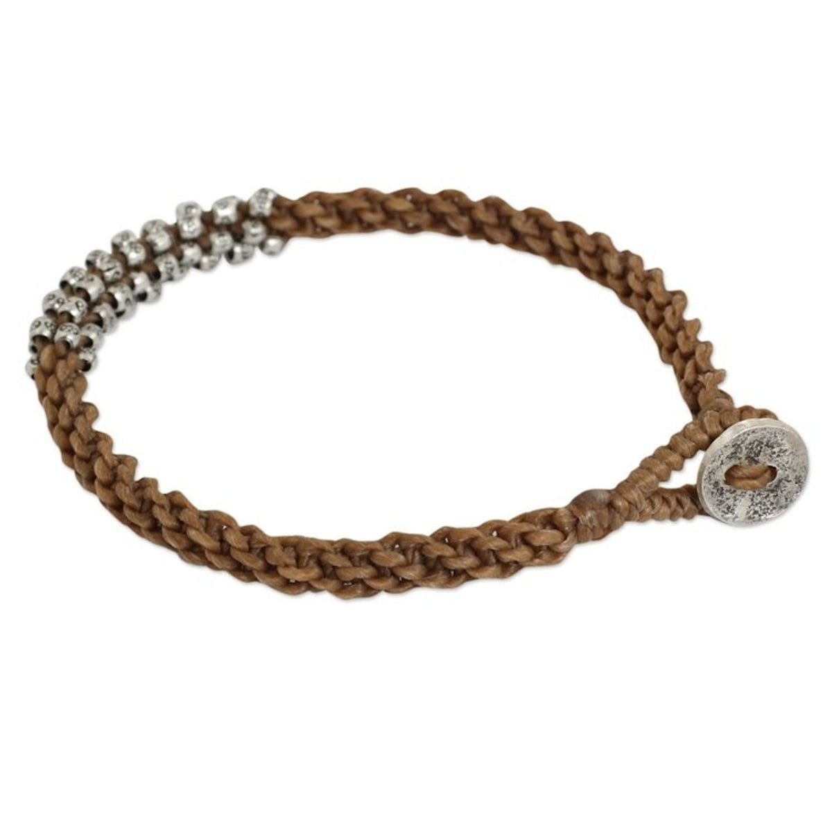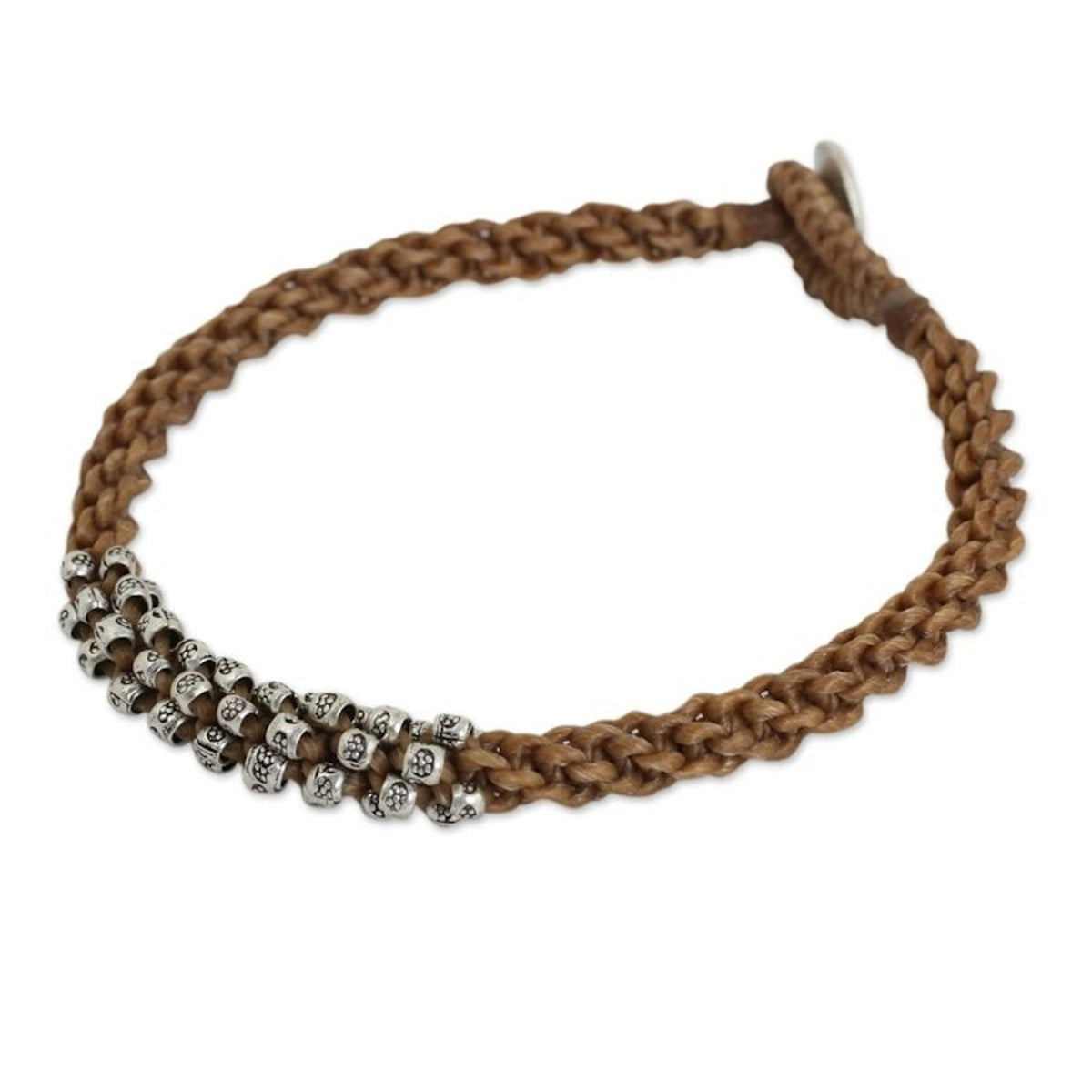 This Handmade Woven Cord Bracelet in Tan with Silver Beads 'Tribal Flowers in Tan' is a dainty and stylish accessory. Designed by Napapat, the braided cord bracelet is adorned with 950 silver beads stamped with a tiny flower motif. The piece, which reflects patience and imagination, is a beautiful representation of the artisan's heartfelt artistry and her lasting connection to Thai tradition.