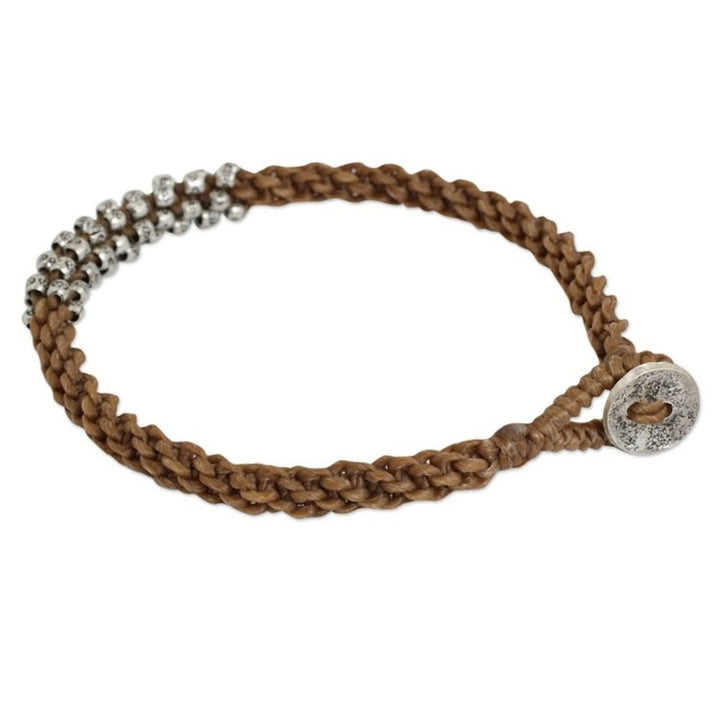 Handwoven Cord Bracelet in Tan with Silver Beads 'Tribal Flowers in Tan'