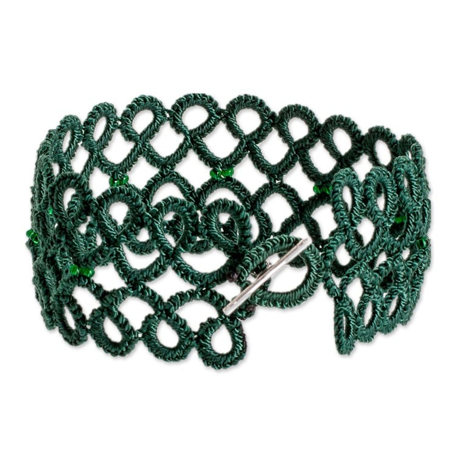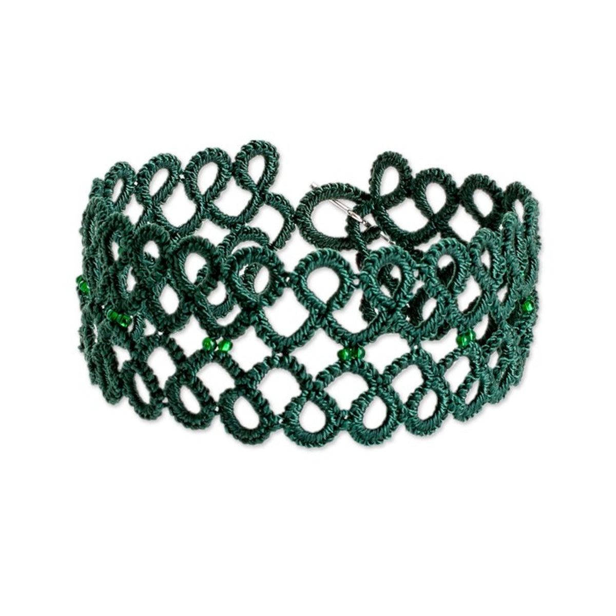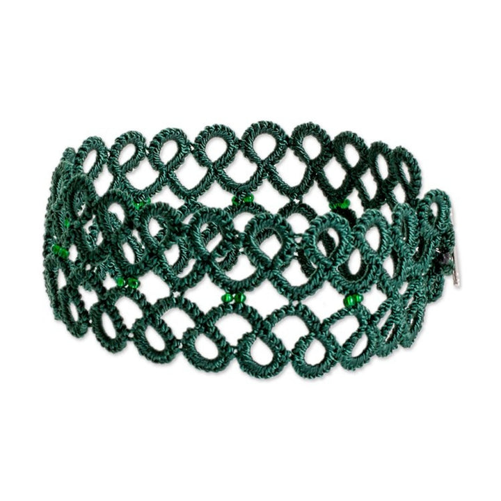 This Handwoven Green Wristband Bracelet with Glass Beads 'Gleams of Harmony' is a lovely and mystical accessory. Designed by Gladys Pichola, the macrame accessory is composed of green nylon cords with diverse heart-shaped details and accented with intense green glass beads. The piece, which honors forgotten techniques and makes them relevant and cherished, is a beautiful representation of the artisan's artistry and her celebration of heritage and craft.