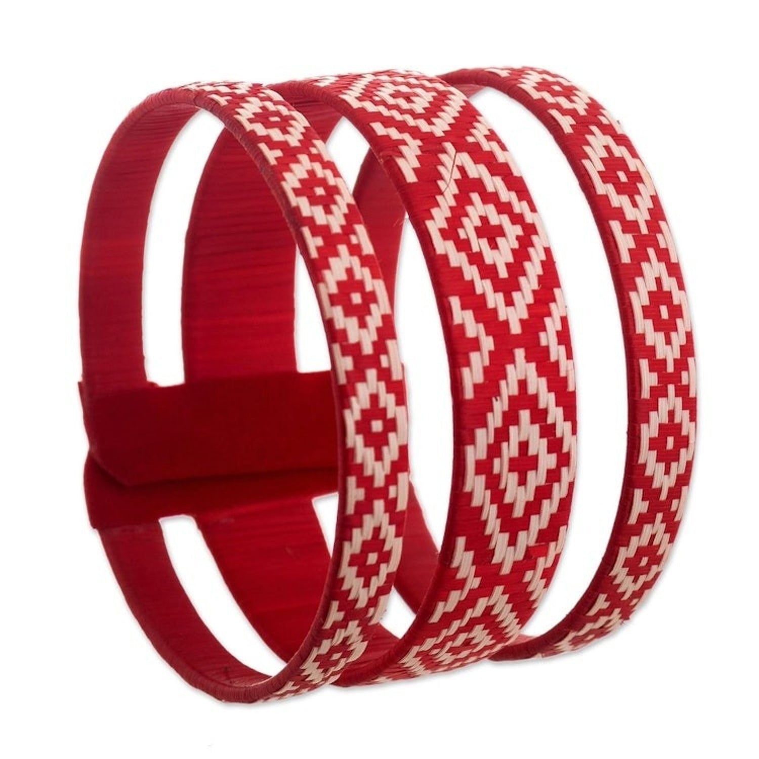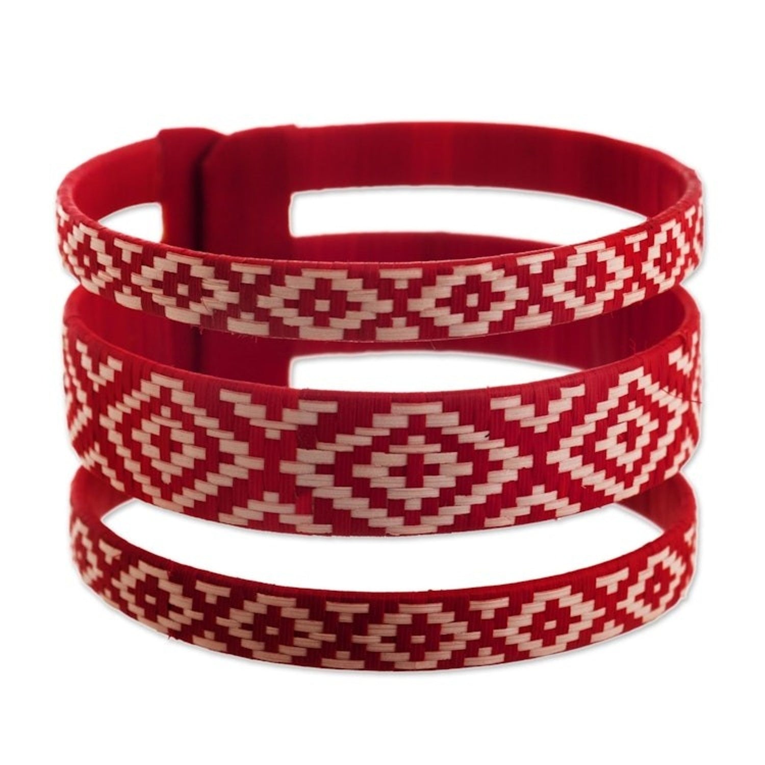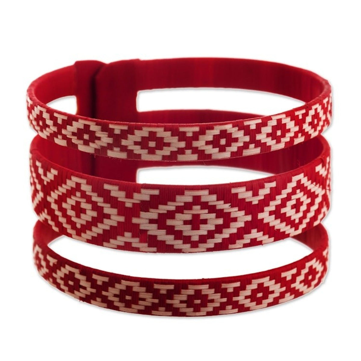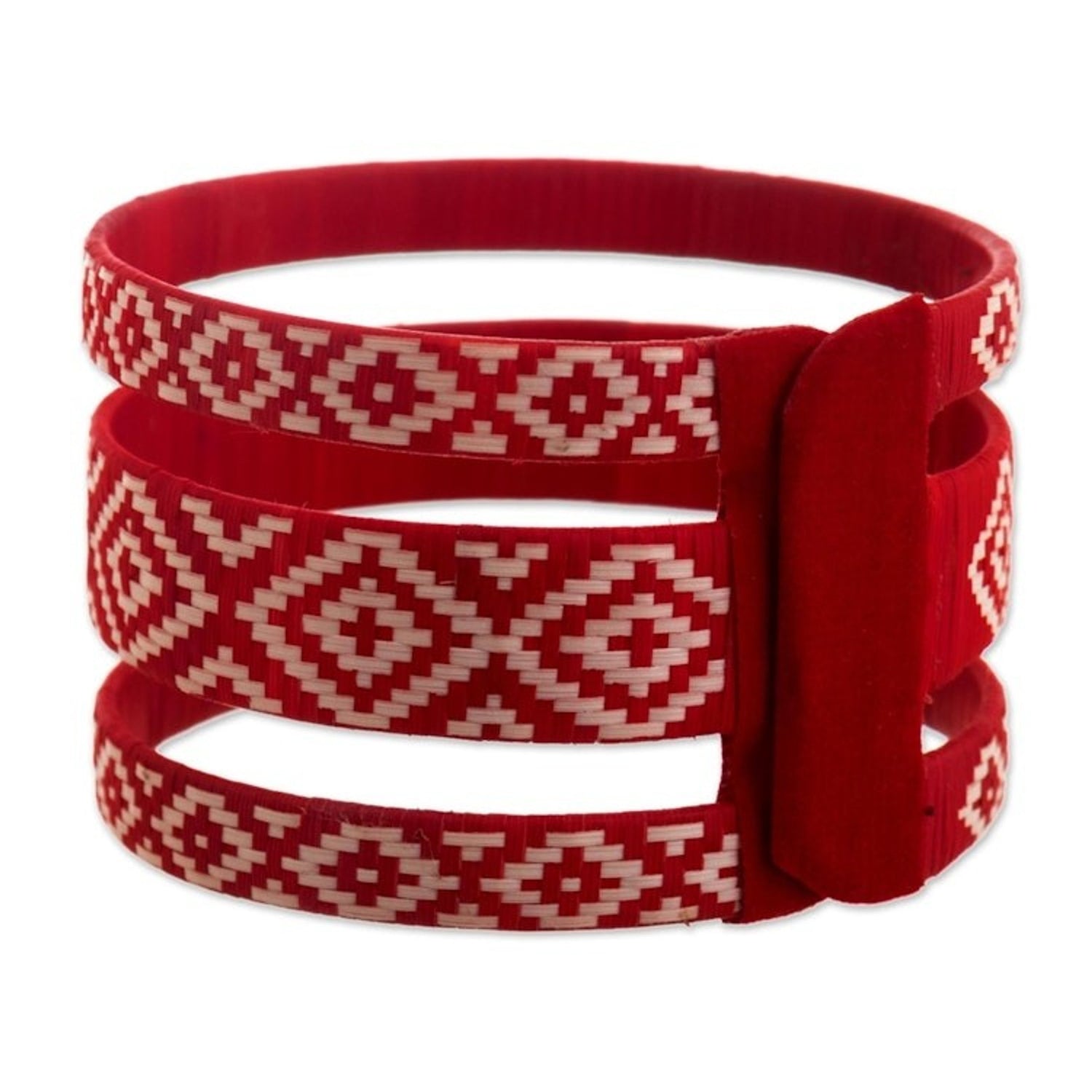 This Handwoven Natural Fiber Cuff Bracelet 'Soul of Fire' is a beautiful and cultural accessory. Crafted by artisans of the Zenú Community, the wide cuff is woven with caña flecha fibers in strawberry red and off-white, creating the illusion of three bracelets. The piece, which preserves ancestral traditions and techniques, is a beautiful representation of the community's identity and living tradition.