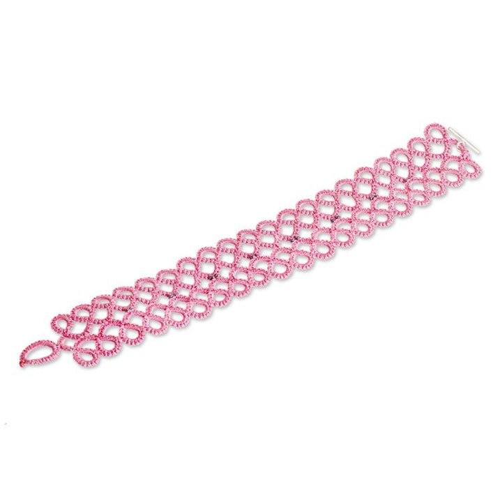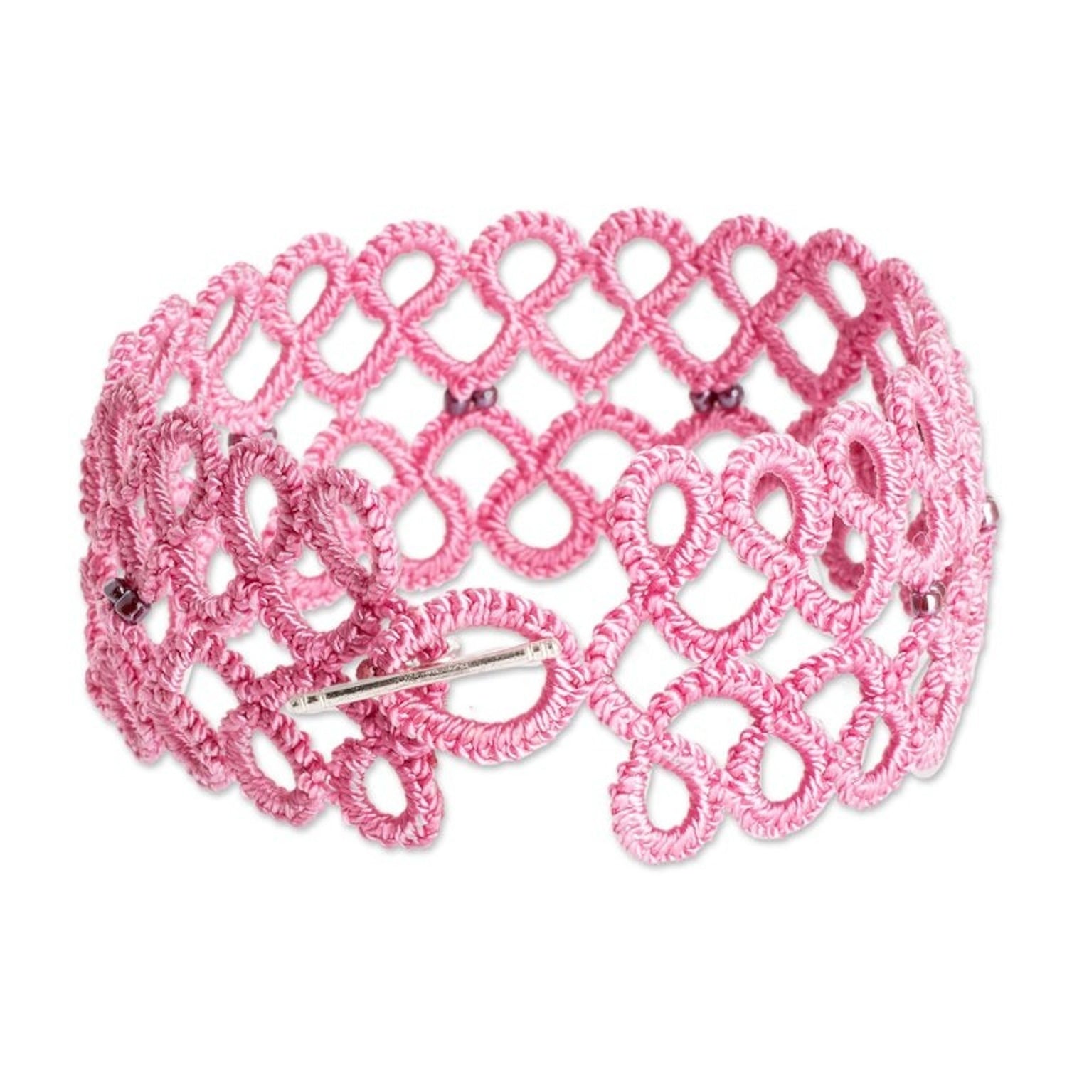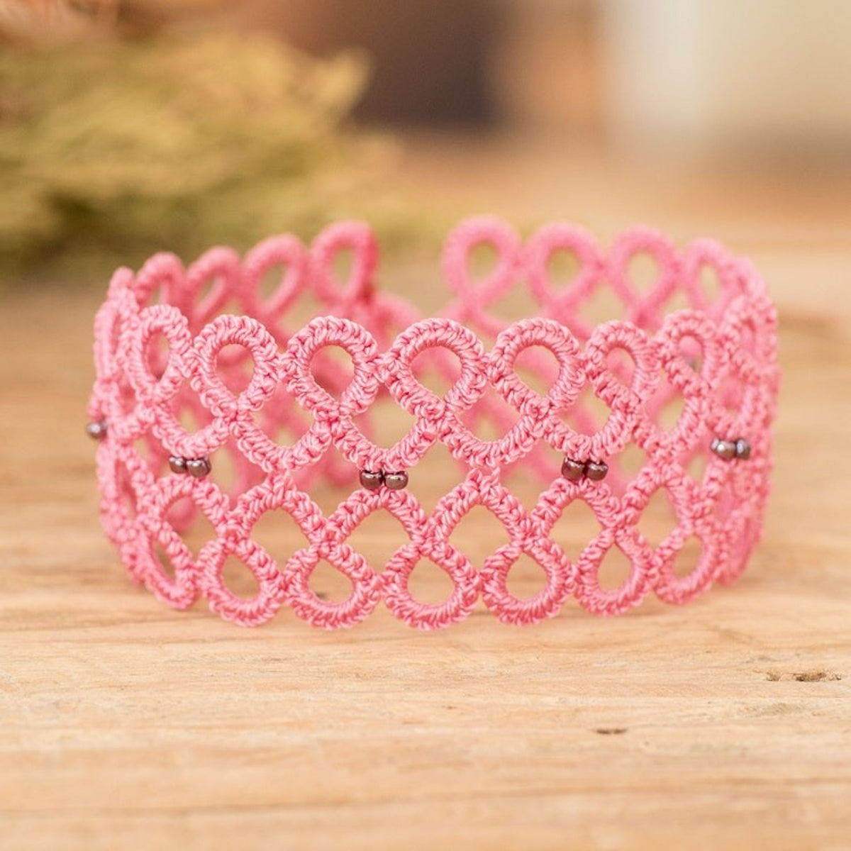This Handwoven Pink Wristband Bracelet with Glass Beads 'Gleams of Sweetness' is an adorable and sweet accessory. Designed by Gladys Pichola, the macrame accessory is composed of pink nylon cords with diverse heart-shaped details and accented with intense purple glass beads. The piece, which honors forgotten techniques and makes them relevant and cherished, is a beautiful representation of the artisan's artistry and her celebration of heritage and craft.