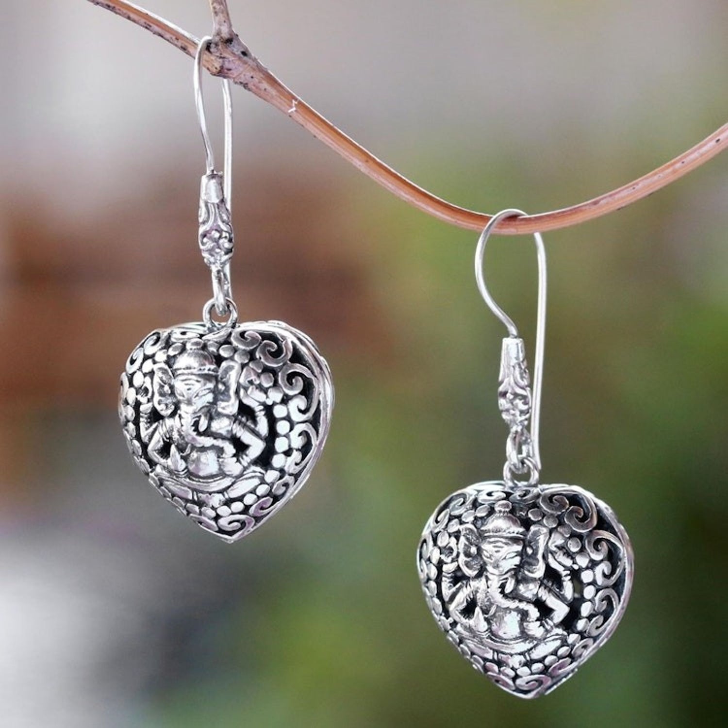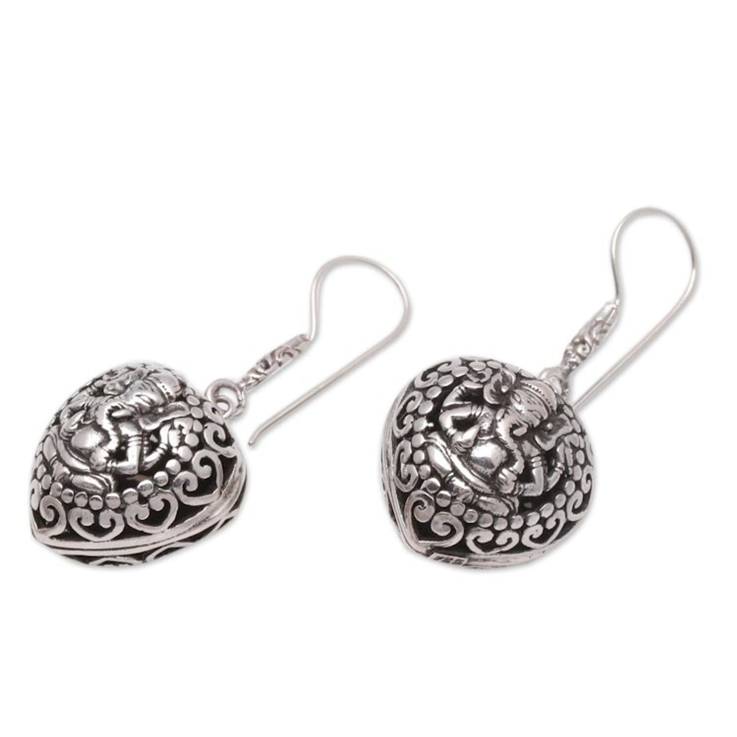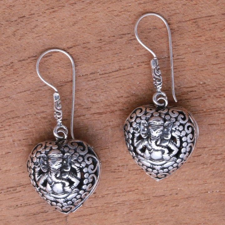 Heart-Shaped Sterling Silver Ganesha Dangle Earrings 'Heart of Ganesha'