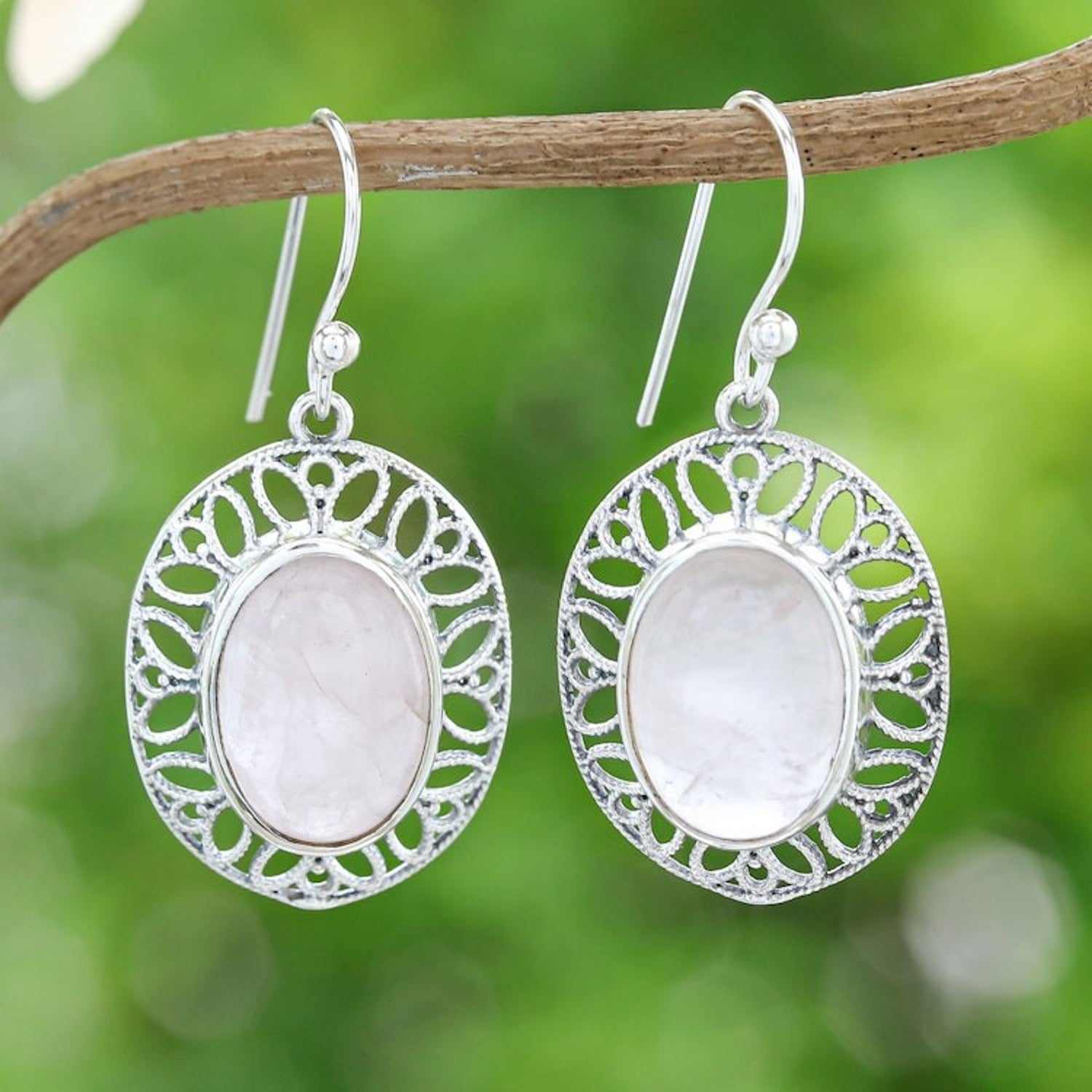 Handcrafted in Thailand with .925 sterling silver and rose quartz. Each earring measures 1.4 inches in length and 0.7 inches in width. They have a high-polish finish. Natural stone variations are expected.