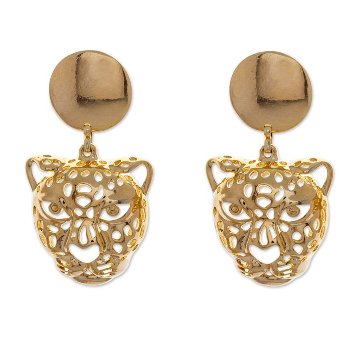 These High-Polished Jaguar-Themed 24k Gold-Plated Dangle Earrings 'Divine Jaguar' are a fierce and radiant accessory. Designed by Ali Guzman, the dangle earrings are crafted from 24k gold-plated brass and feature stunning jaguar pendants. The pieces, which are inspired by the divine power of the jaguar, are a beautiful representation of the artisan's belief in jewelry as a channel for energy, emotion, and transformation.