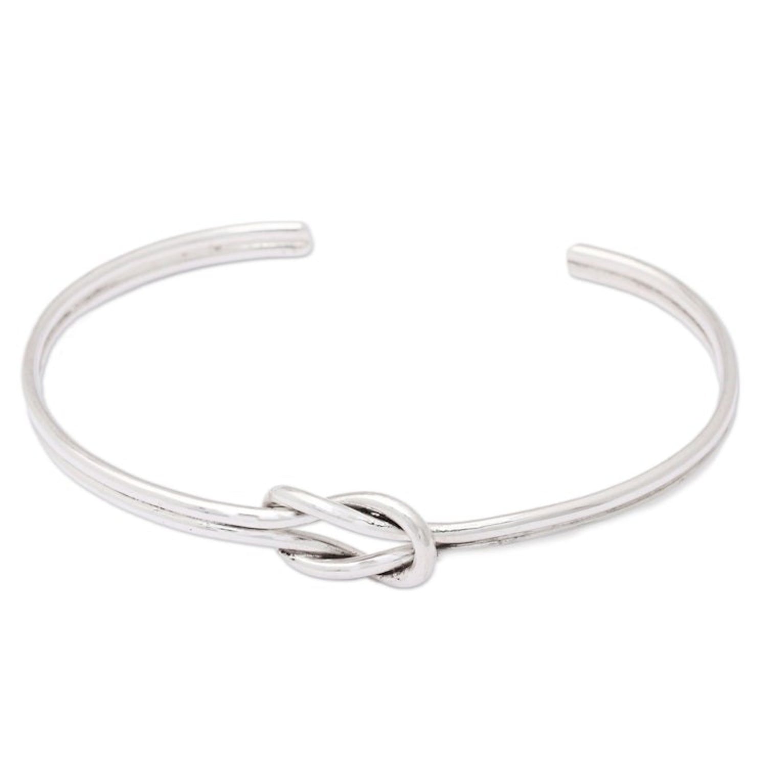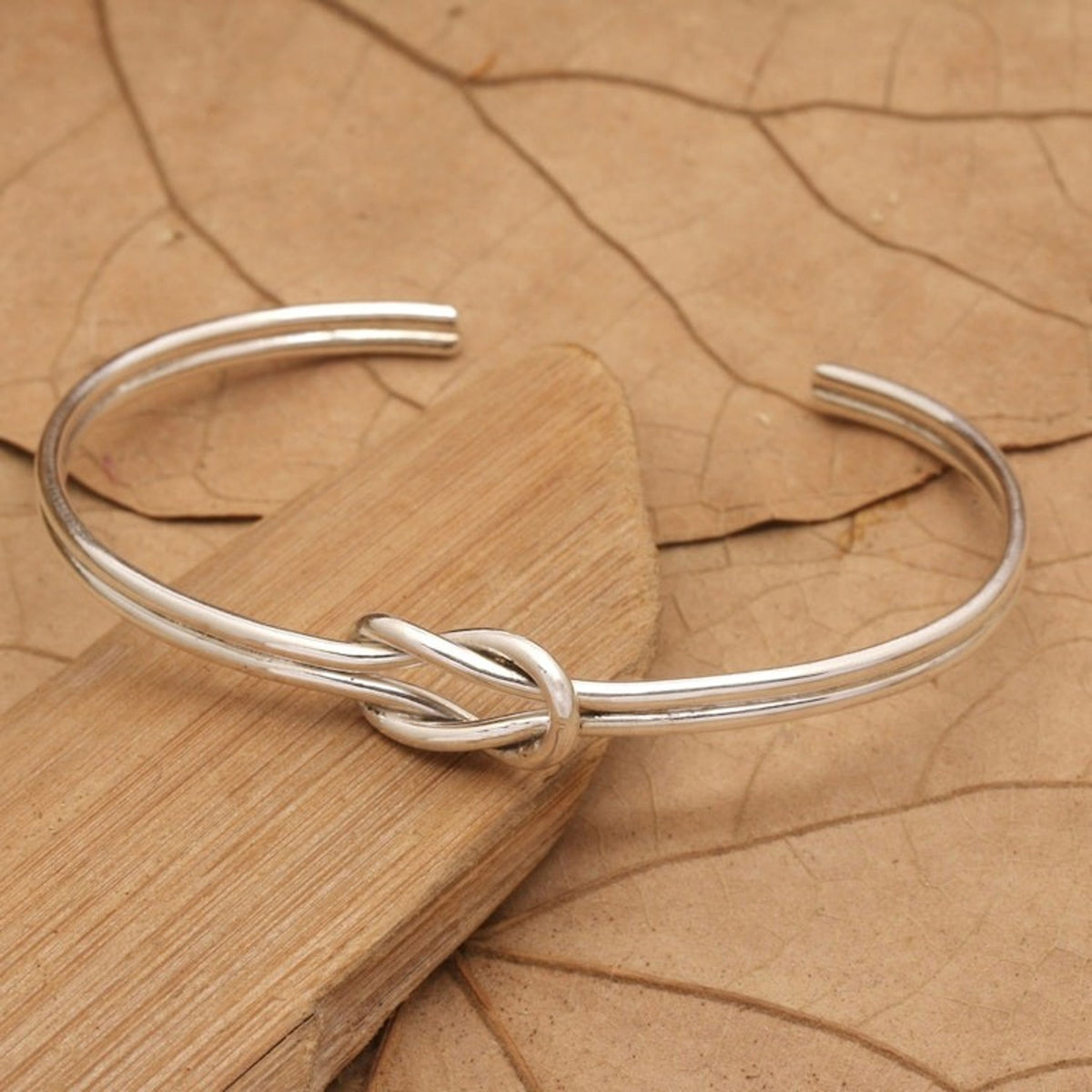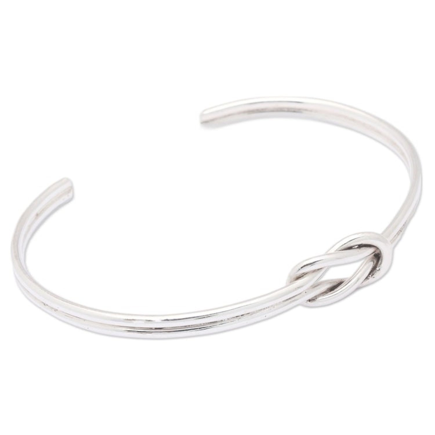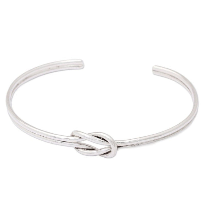 This High-Polished Modern Sterling Silver Cuff Bracelet 'Faithful Spirit' is an avant-garde and bold accessory. Designed by Griya Suarningsih, this high-polished cuff bracelet features a knot detail at the center as a symbol of strength and loyalty. The piece, which is rooted in Bali's cultural heritage yet attuned to evolving design trends, is a beautiful representation of the artisan's artistry, resilience, and continuity.