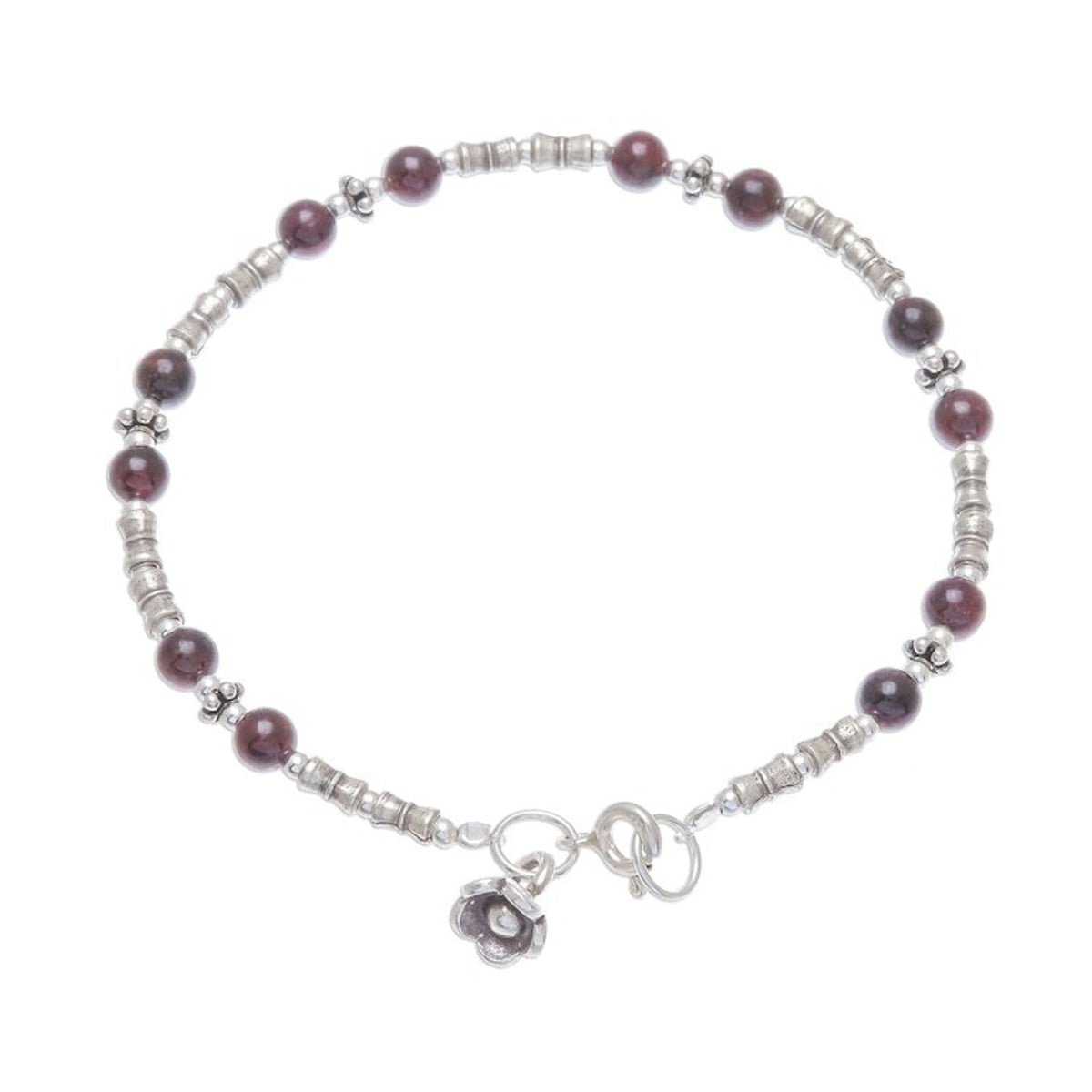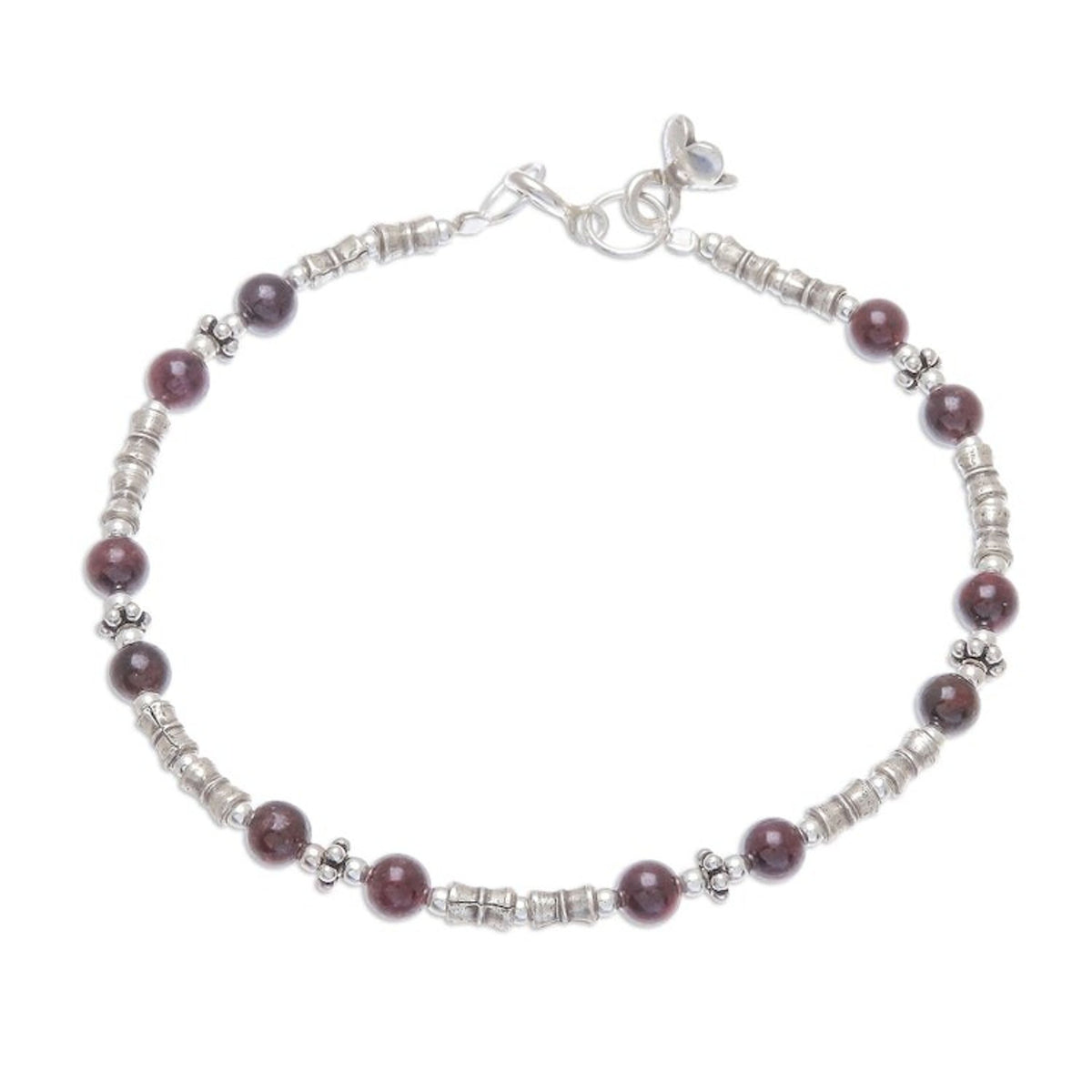 Handcrafted in Thailand with .950 and .925 sterling silver and garnet. The bracelet is 7 inches long. It has a combination finish. Natural stone variations are expected.