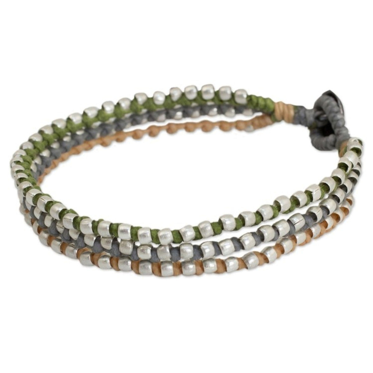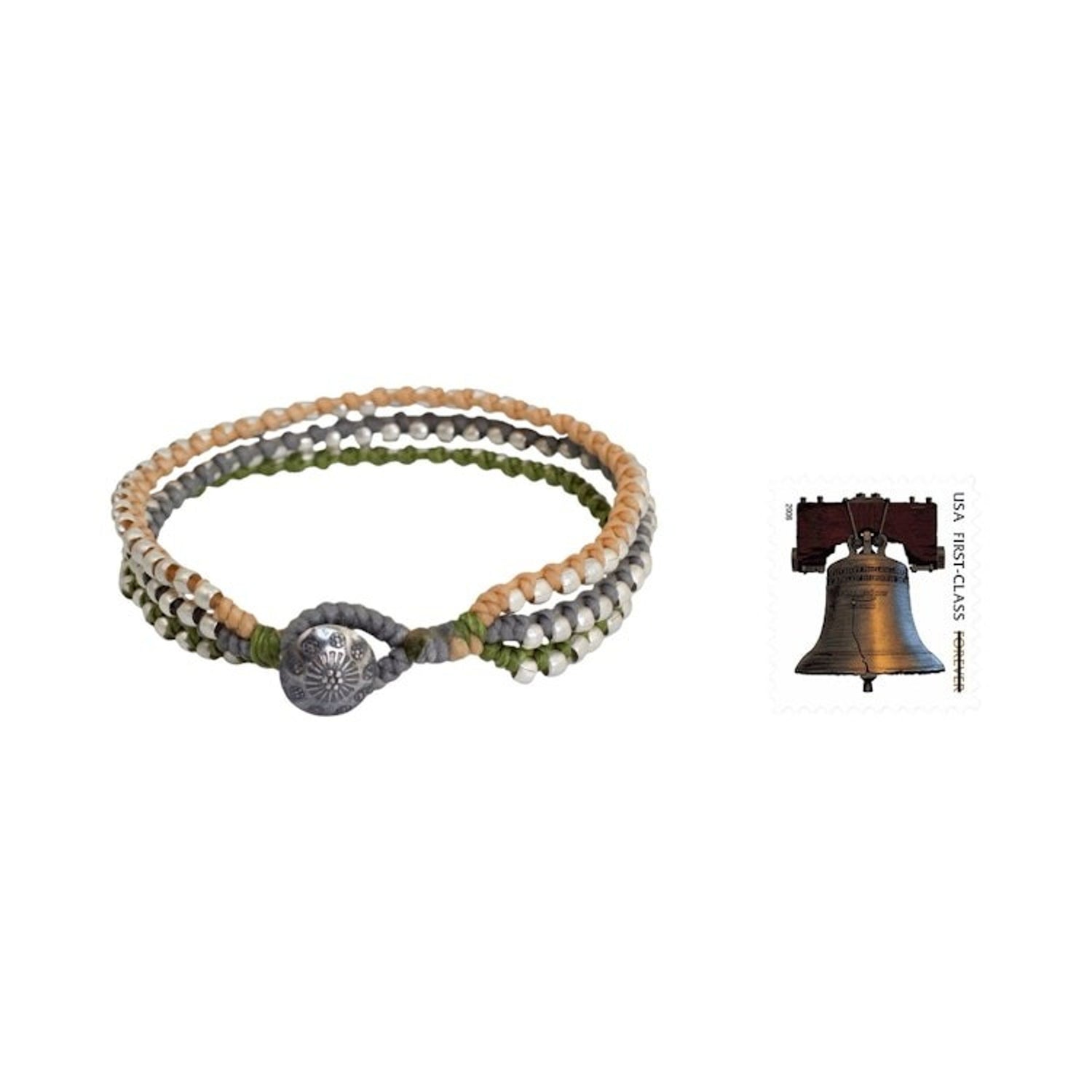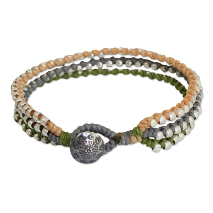 This Hill Tribe Jewelry Bracelet in Peach Gray and Green 'Pastel Siam Melody' is a cheerful and traditional accessory. Designed by Napapat, this wristband bracelet features three hand-knotted bracelets in shades of gray, green, and peach. The pieces, which blend ethnic Thai influences with modern durability, are a beautiful representation of the artisan's patience, imagination, and heartfelt artistry.