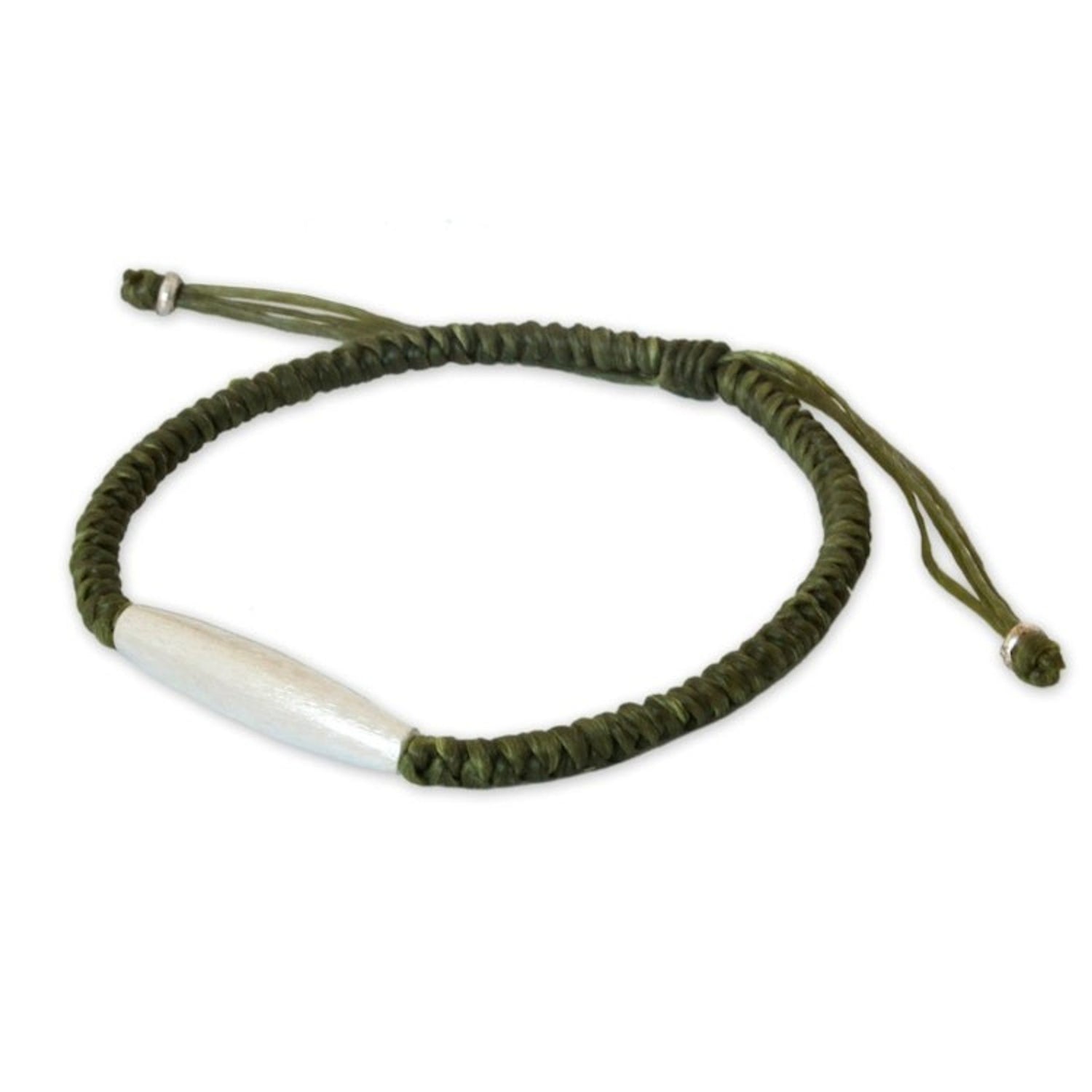 Handcrafted in Thailand with .950 silver and waxed polyester cords. The bracelet adjusts from 7 to 11 inches in length. It has a brushed-satin finish. Natural variations are expected.