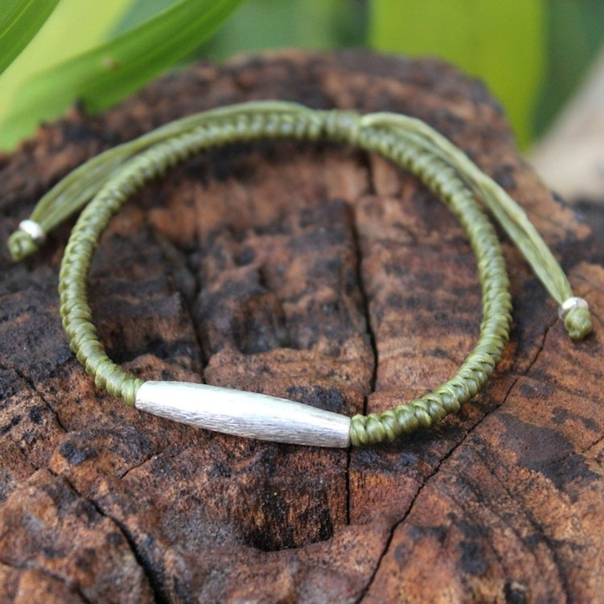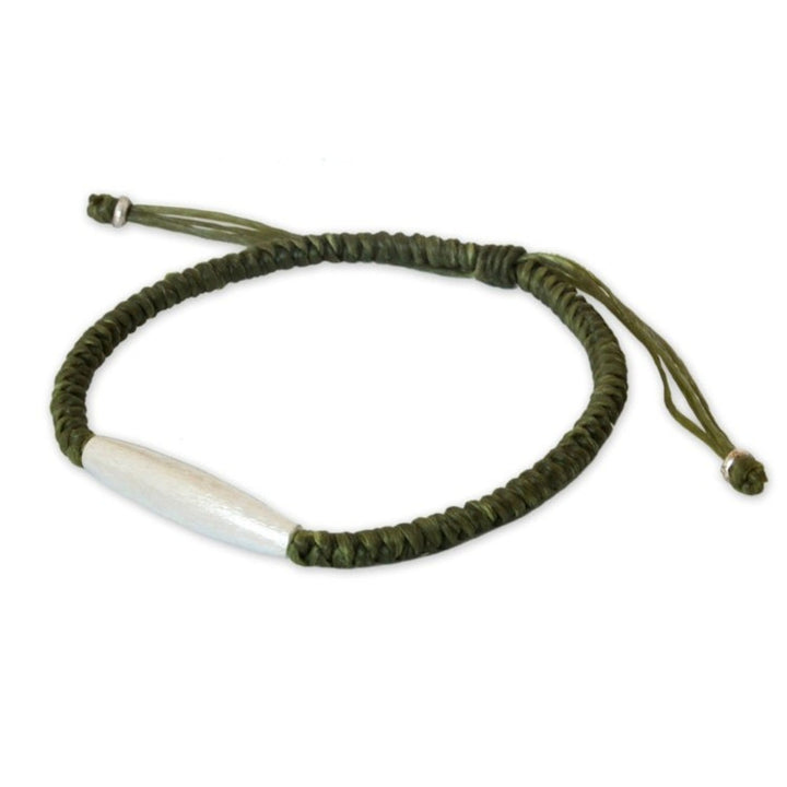 This Hill Tribe Silver Braided Bracelet 'Peaceful Jungle' is an enchanting and tranquil accessory. Designed by Napapat, this bracelet is made of a sweet green waxed polyester cord and features a brushed .950 silver bead from Karen hill tribe artisans. The piece, which blends ethnic Thai influences with modern durability, is a beautiful representation of the artisan's patience, imagination, and heartfelt artistry.