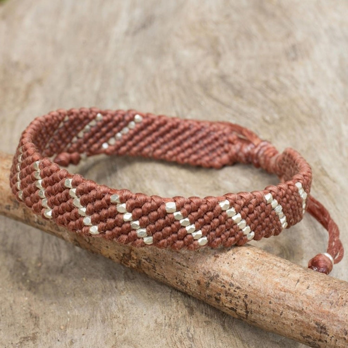 This Hill Tribe Silver Modern Brown Macrame Bracelet 'Cinnamon Spin' is a beautiful and modern accessory. Designed by Napapat, this macrame bracelet is knotted by hand on cinnamon brown cords and features shining .950 silver beads that form diagonal rows. The pieces, which blend ethnic Thai influences with modern durability, are a beautiful representation of the artisan's patience, imagination, and heartfelt artistry.