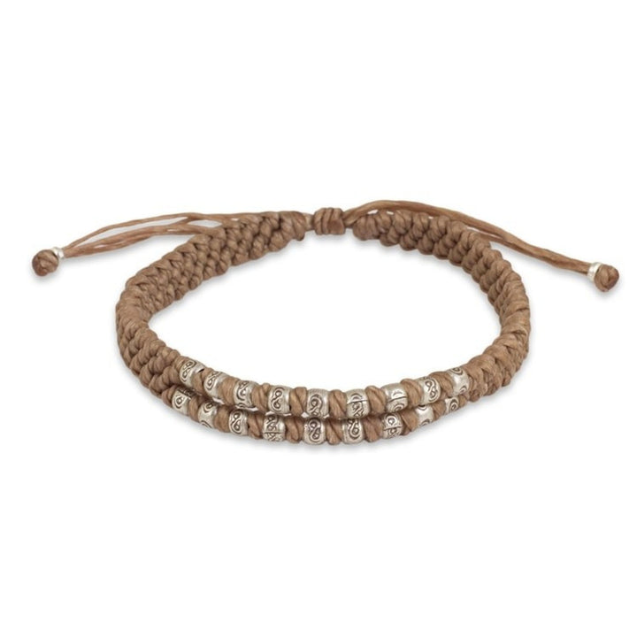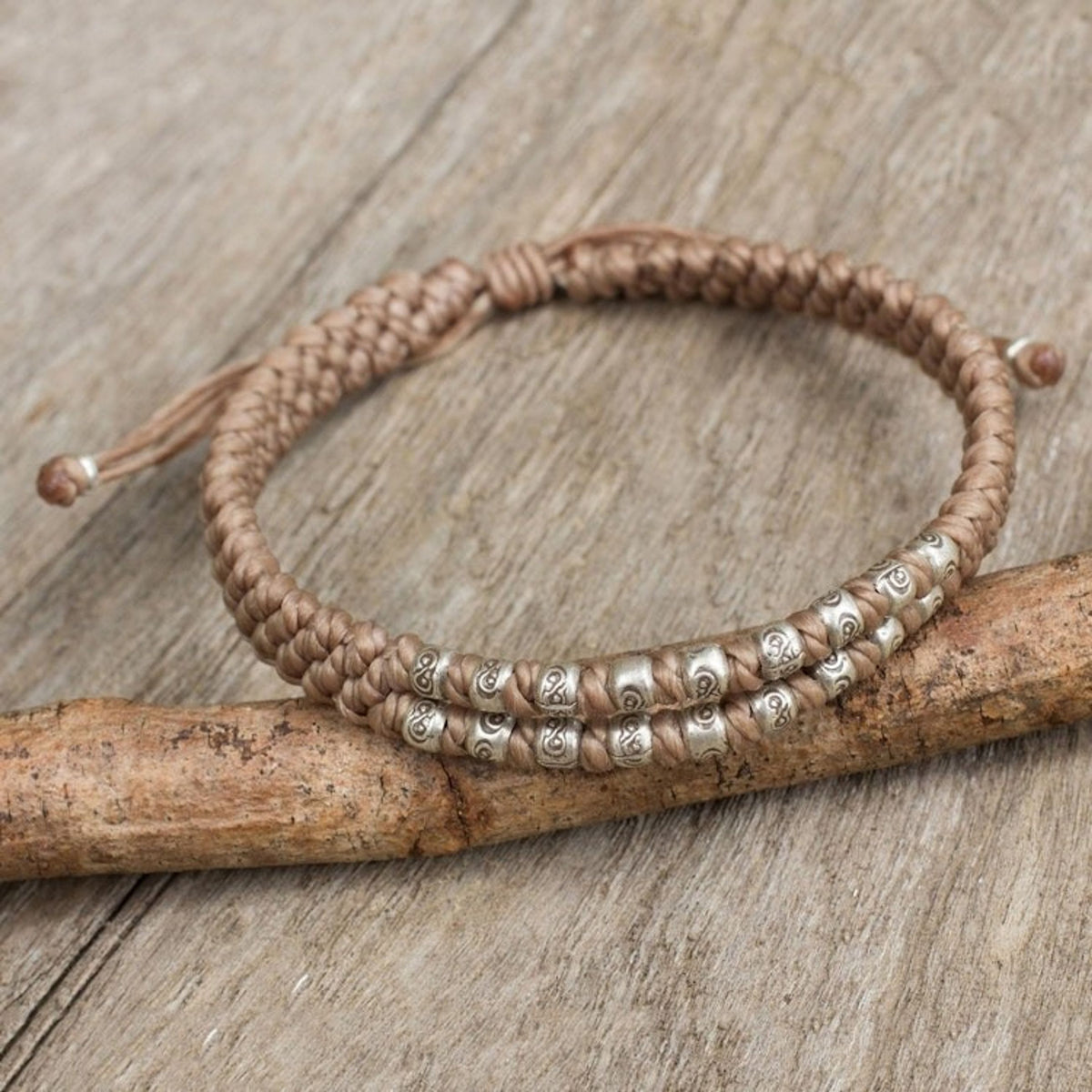 This Hill Tribe Silver on a Thai Hand Knotted Wristband Bracelet 'Khaki Infinity Twins' is an enchanting and traditional accessory. Designed by Napapat, this wristband bracelet is knotted by hand of khaki-brown cords and features diminutive .950 silver beads with engraved infinity motifs. The pieces, which blend ethnic Thai influences with modern durability, are a beautiful representation of the artisan's patience, imagination, and heartfelt artistry.